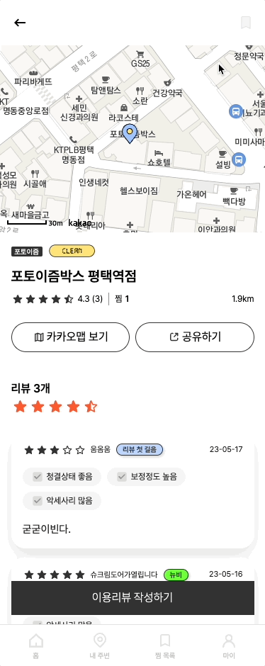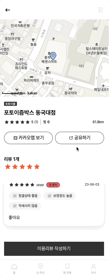 - 현재 내 위치 근처에 가까운 네컷사진(인생네컷, 하루필름, 포토이즘 등)지점 정보와 청결도, 소품 등 분류별 리뷰를 볼 수 있어요.