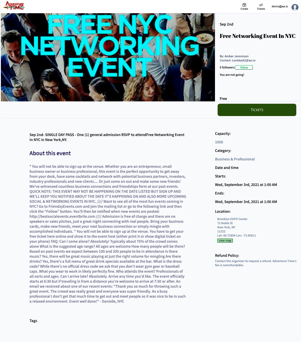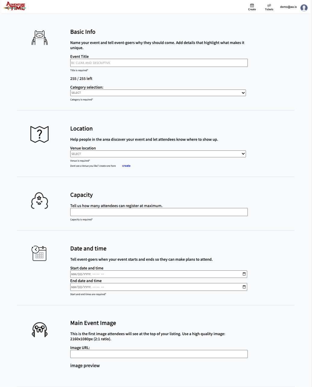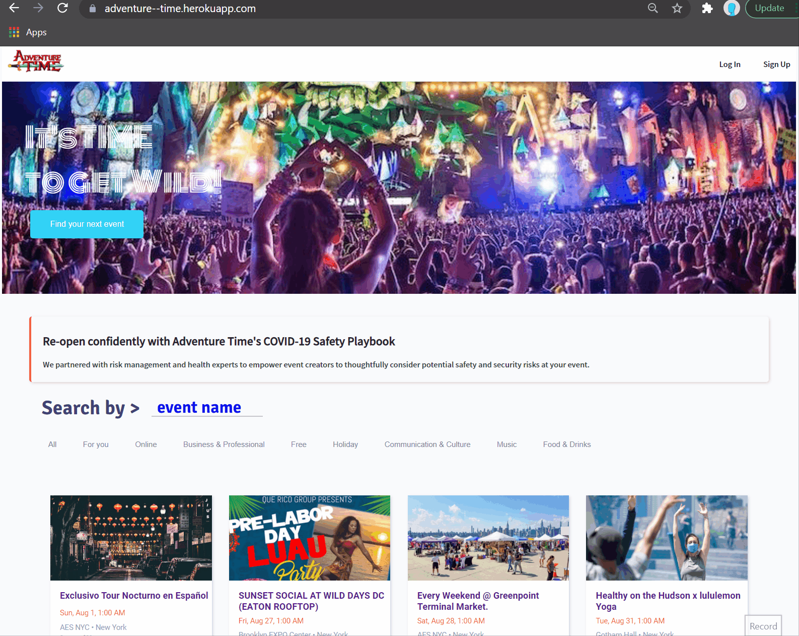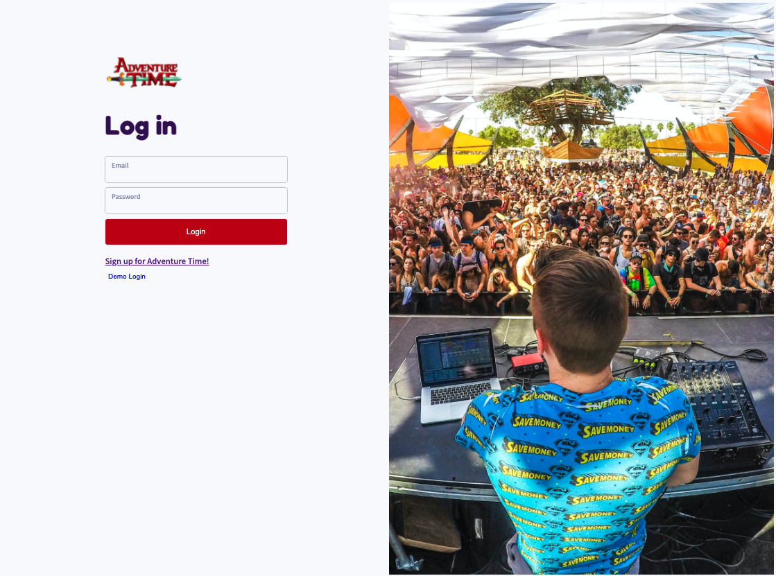 Adventrure_Time is an Eventbrite clone with a theme of the cartoon Adventure Time. It is a platform where users can search and purchase tickets to exciting events across the nation or create their own event within their own community. Adventrure_Time is a fullstack React Redux application with a Python backend incorporating FLask & SQL-Alchemy with a PostgresSQL database system and Heroku to host.