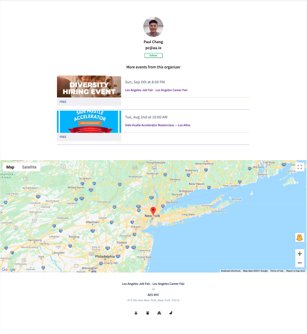 Event feed will displays all pertinent information about the event and users may also follow the event promoter (creater of event)