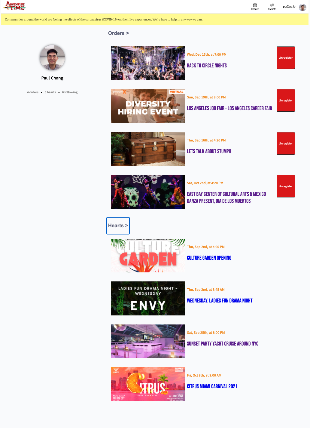 Users may view favorited events & registered tickets. Users may also unregister for tickets on this page.