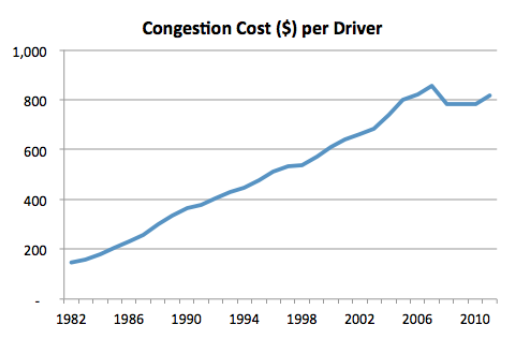 It is estimated that the average american will lose about 97 hours every year as a result of traffic congestion, which has significant financial effects. If you take a look at this graph provided by INRIX (the world leader in mobility analytics), you can see that the congestion cost per driver, the cost of congestion which takes into account the increase in fuel wasted, negative effects of pollution, and other factors, has hit record highs and is only increasing. Our goal is to reduce this, to mitigate the effects of traffic congestion by exploring the effectiveness of applying reinforcement learning to traffic light signal control.