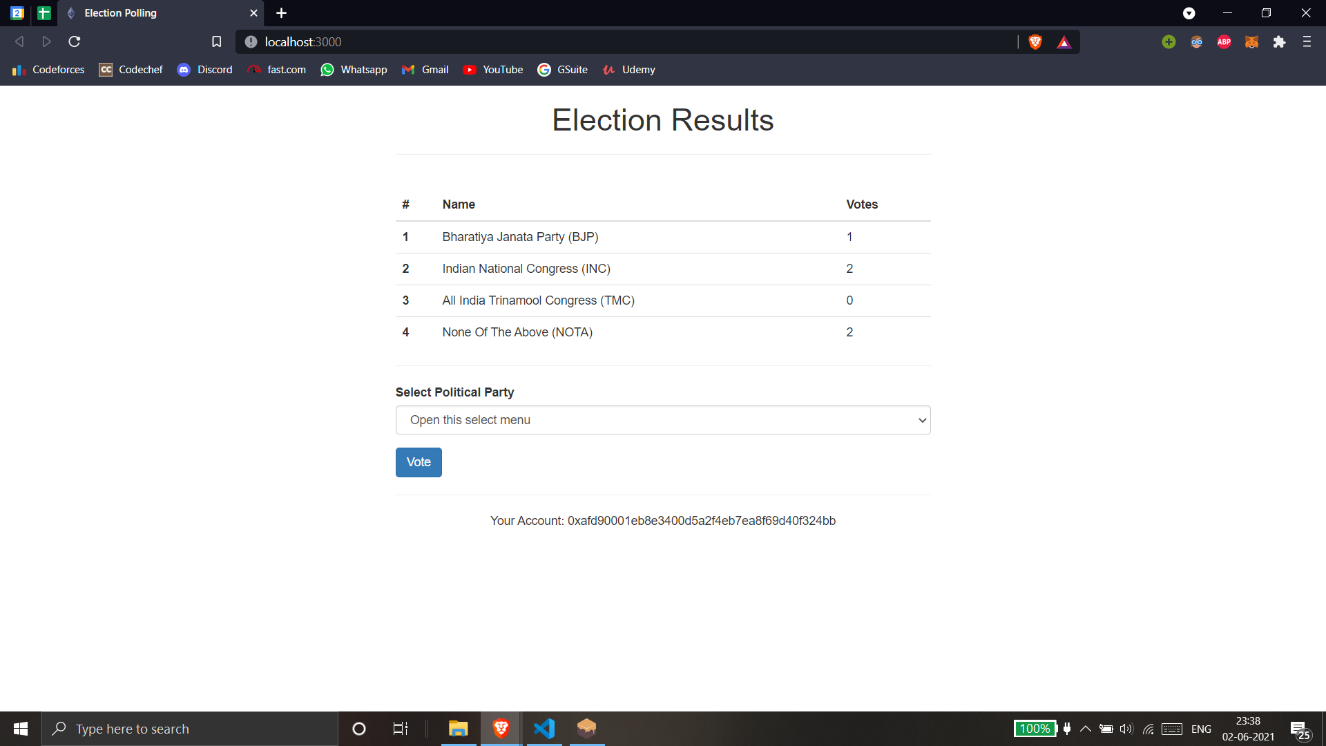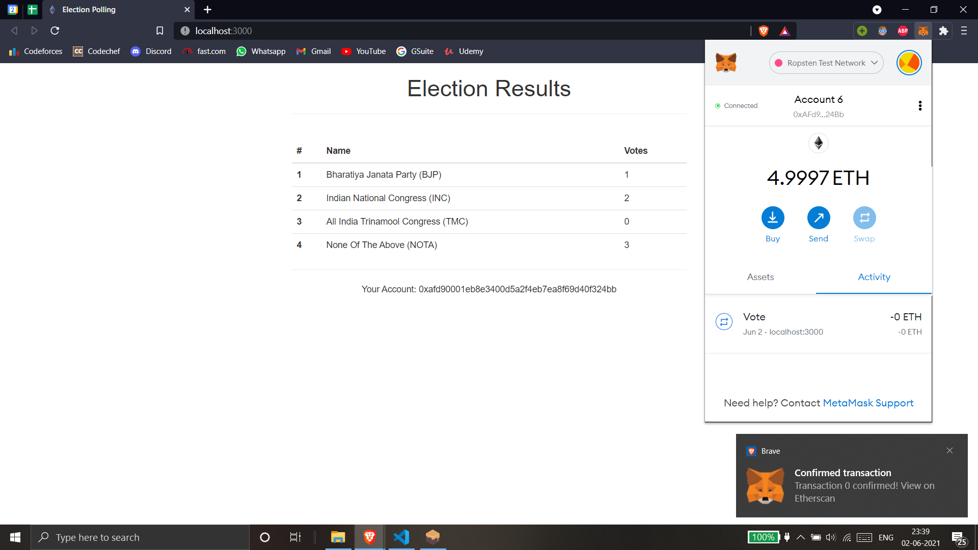 A decentralized application (dapp) built with Solidity and Truffle, and deployed on the blockchain (Ethereum based Ropsten test network). Frontend is built using HTML, CSS (bootstrap) and JavaScript. The votes cast by people are stored on a public blockchain which makes the election process highly secure, immutable, transparent, anonymous, fast and cost-effective.