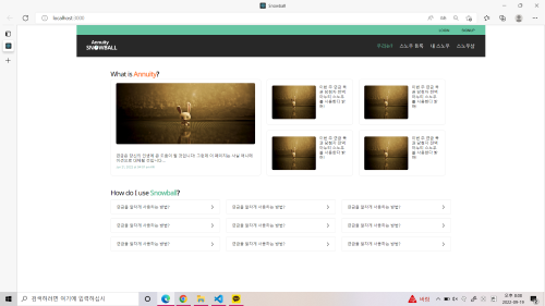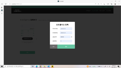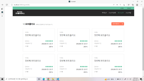 Team 연금스노우볼 📌 개발일정 🚩 2022년 6월 ~ 2022 11월 LOGO 👪 팀원 소개 👪 팀원 팀장 문환룡(깃허브이름) Github 적고싶은대로 적어주세용 팀원 권성민(kwonja) Github Frontend Developer 팀원 박태현(깃허브이름) Github 적고싶은대로 적어주세용 팀원 김상수(깃허브이름) Github 적고싶은대로 적어주세용 적고싶은대로 적어주세용 적고싶은대로 적어주세용 ❓ 프로젝트 배경 ❓ ⚽ 프로젝트 목표 🎮 동작방식 🎮 🎲 개발화면 🎲 ✅ 메인 ✅ 포트폴리오 등록 ✅ 포트폴리오 결과 ✅ 내 스노우 ✅ 스노우샵 ✅ 로그인 ✅ 회원가입 & 이용약관 ✅ 테스트 환경(배포사이트) 연금스노우볼사이트 ✅ 개발시연영상 https://www.youtube.com/watch?v=oFdkSmKyyI0 깃허브규칙, 개발환경, 개발버전 등등 있지만 일단 생략 test of making strategy page config backend env $ cd backend $ python3 -m venv ./ $ source bin/activate (backend)$ pip install -r requirements (backend)$ python main.py config frontend env $ cd frontend $ npm start