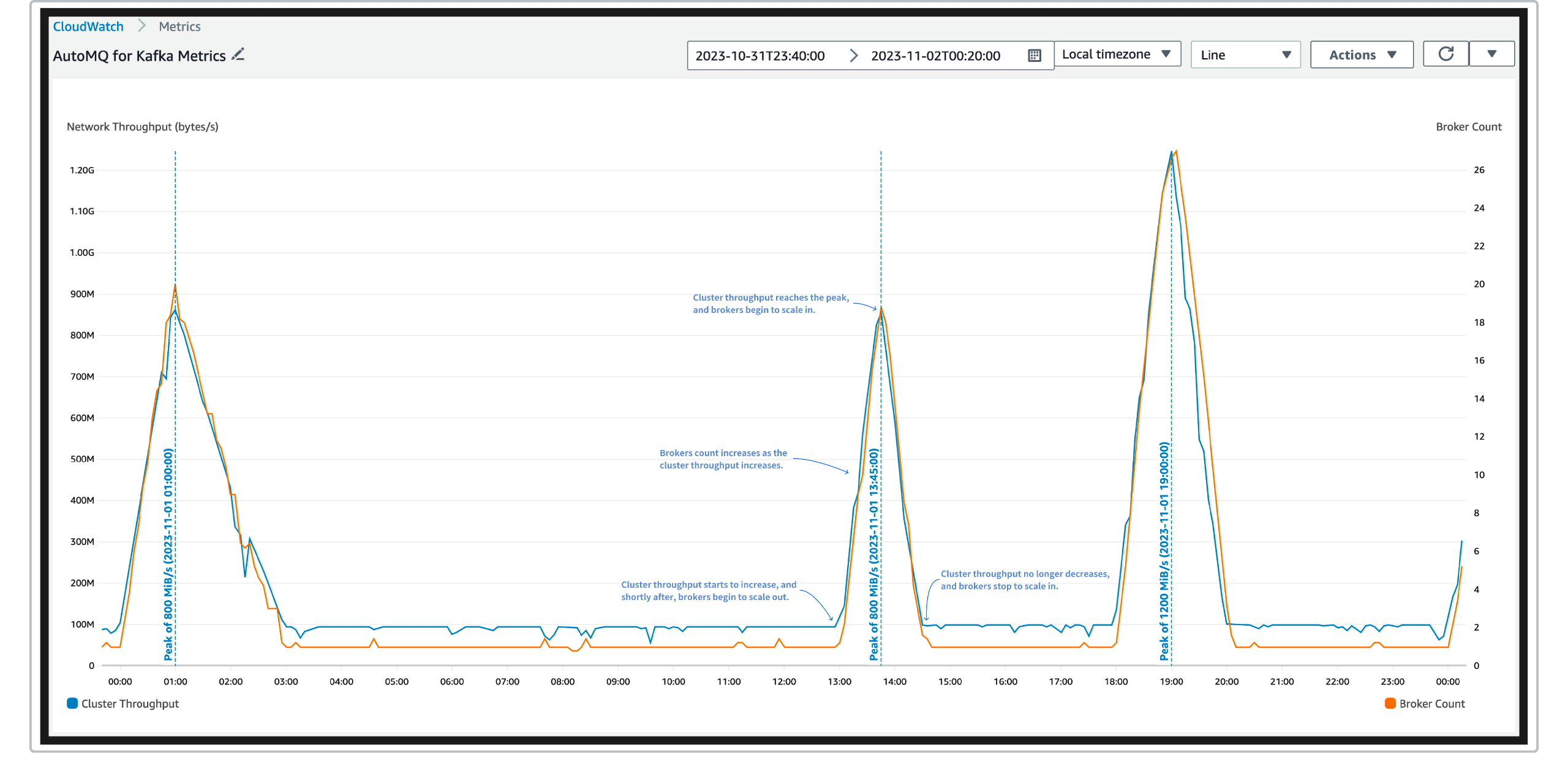 Using AWS CloudWatch, you can obtain the relationship between the number of brokers and the total cluster traffic over time. As shown below: