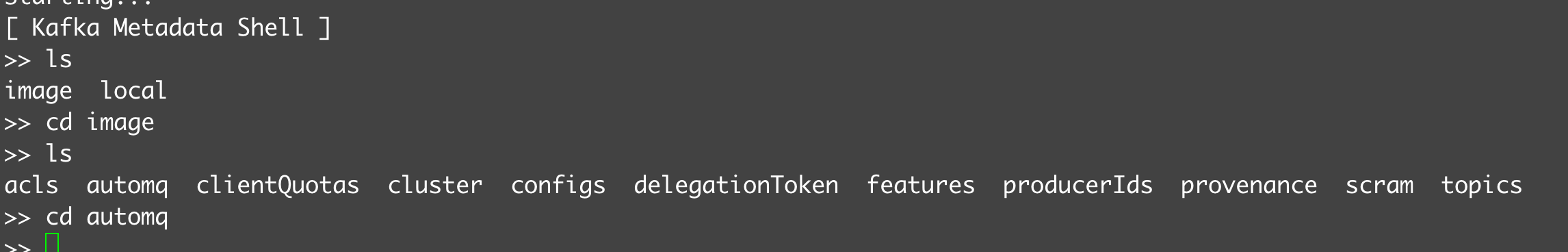 ./kafka-metadata-shell.sh -s /tmp/kraft-combined-logs/__cluster_metadata-0/000000000000000xxxxxx-00000000xxx.checkpoint