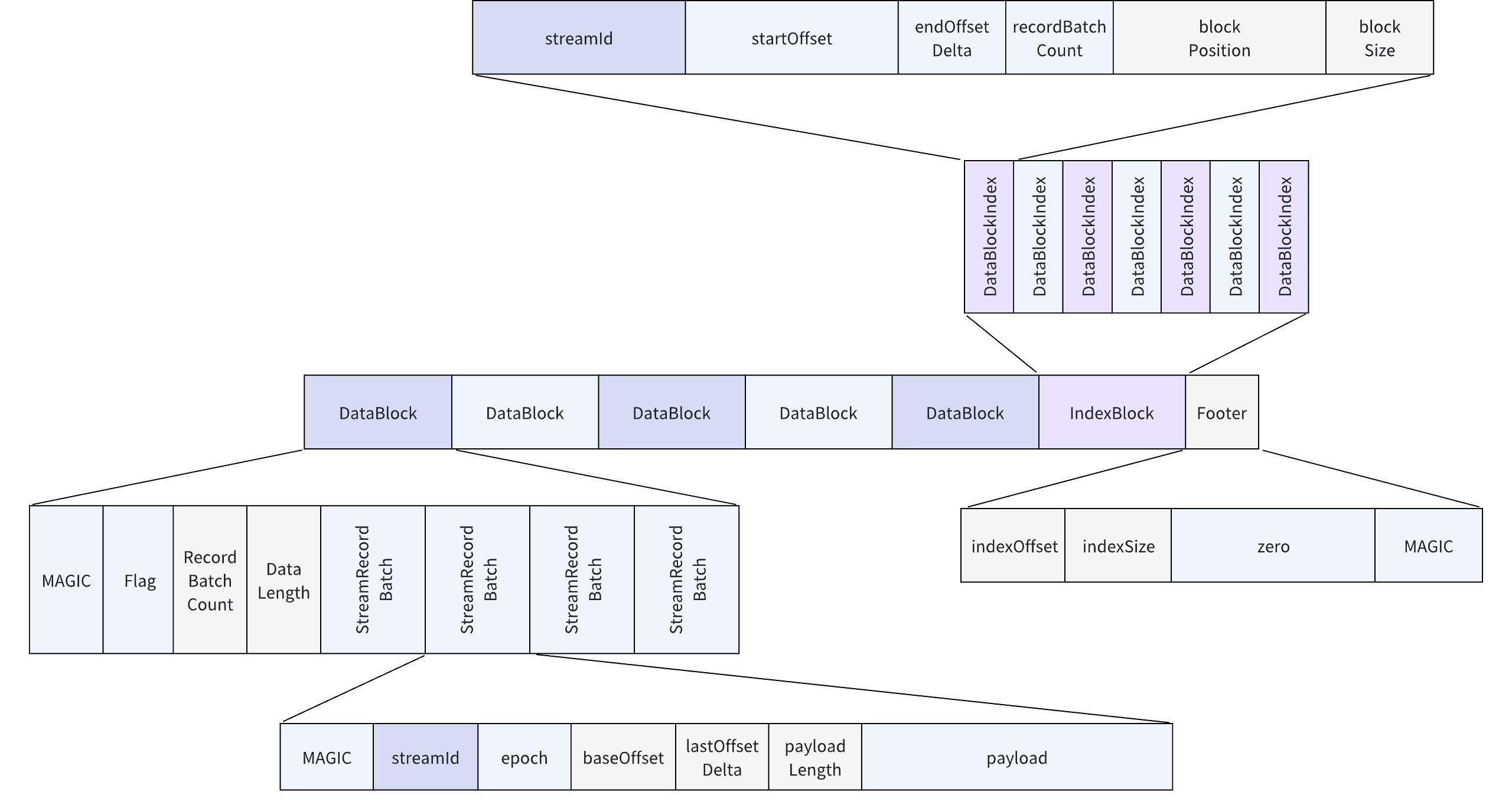 Data in the IndexBlock is sorted by (streamId, startOffset), enabling quick location of the actual DataBlock through binary search.