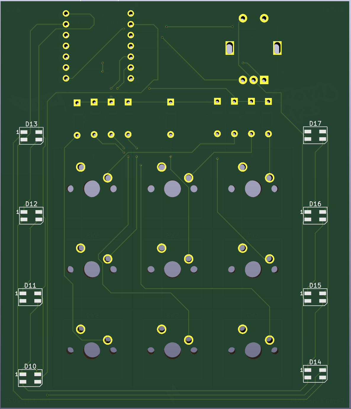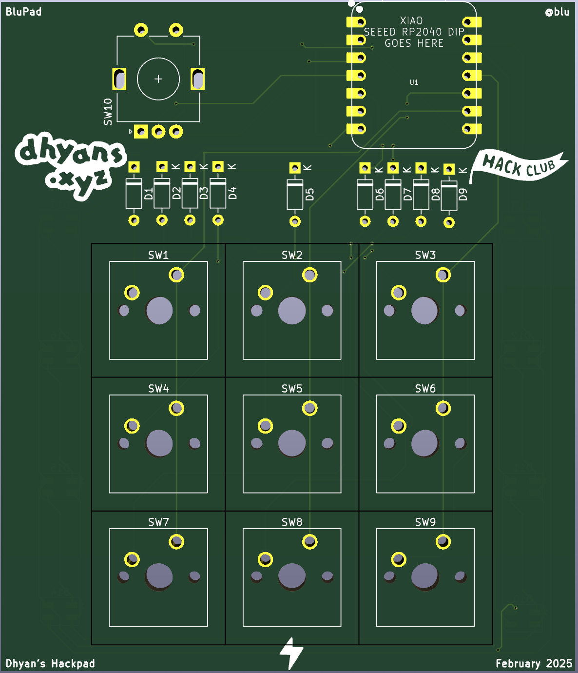 This was unlike anything I have undertaken before and I do not know if my HackPad has all the necessary components. I had many challenges that I had to persevere through while attempting to make my own macropad. At this point in time while it very possibly does not work in it's current form but I am proud of what I have accomplished so far. The first hurdle occured in KiCad where no matter how many times I imported the OPL + SEEED libraries I never got the same footprint as the tutorials so I had to figure out how to use a similar one. Then in KiCad the right menu bar dissapeared (idk why / how) and I couldn't find anywhere online how to make it appear. The elements on the PCB editor was barely visable and I finally got help in the Slack today on how to fix it (this set me back multiple days). The libraries still didn't import the 3d render of the Xiao in the viewer but I think I can solder it on. Routing the copper wires from the ratsnest and organizing the layout was pretty fun :) ! Fusion was unfortunately very slow and took roughly an hour just to get downloaded and setup on my laptop (Fusion is just slow- I didn't do anything) Even through this all, for my first attempt at ever designing a PCB I do not think I did too bad. This has got me interested in hardware based projects and I am definitely planning on persuing deeper into the field!