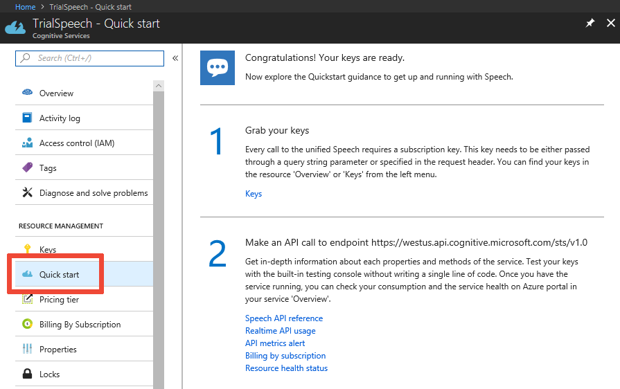 It takes a moment to create and deploy your new Speech resource. Select Quickstart to see information about your new resource.