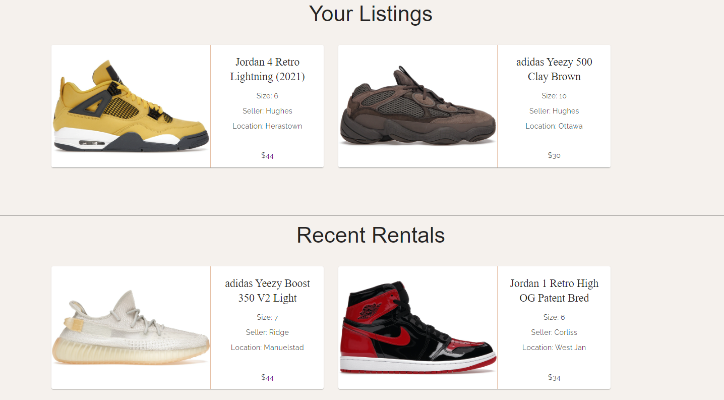 On their profile, users can update their basic information and view all their listings/rentals (if any). Additionally, user can manage their listings/rentals.Furthermore, a user can view all the shoes they are currently renting (borrowing themselves) and opt to release them (give them back). If this is done, that shoe is back on the market.