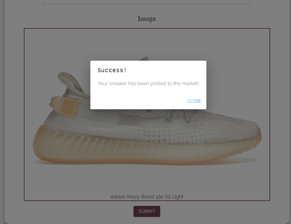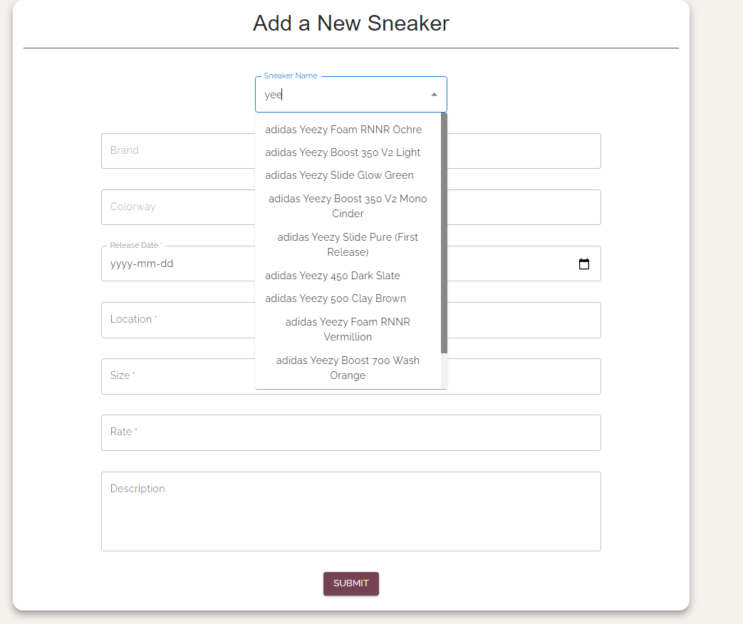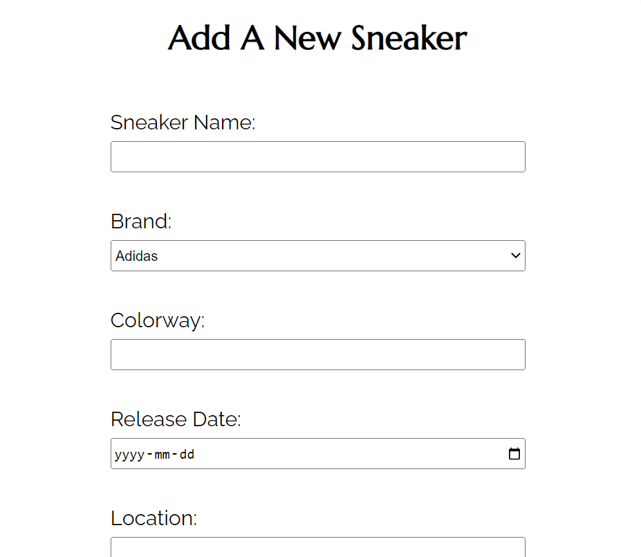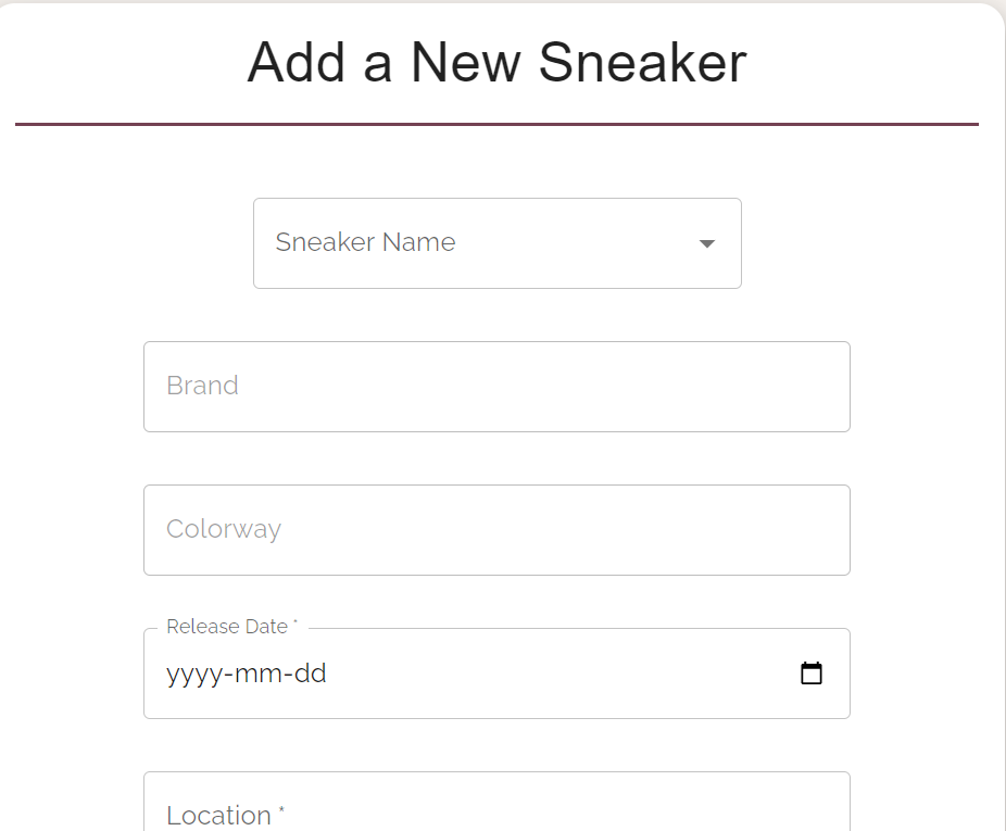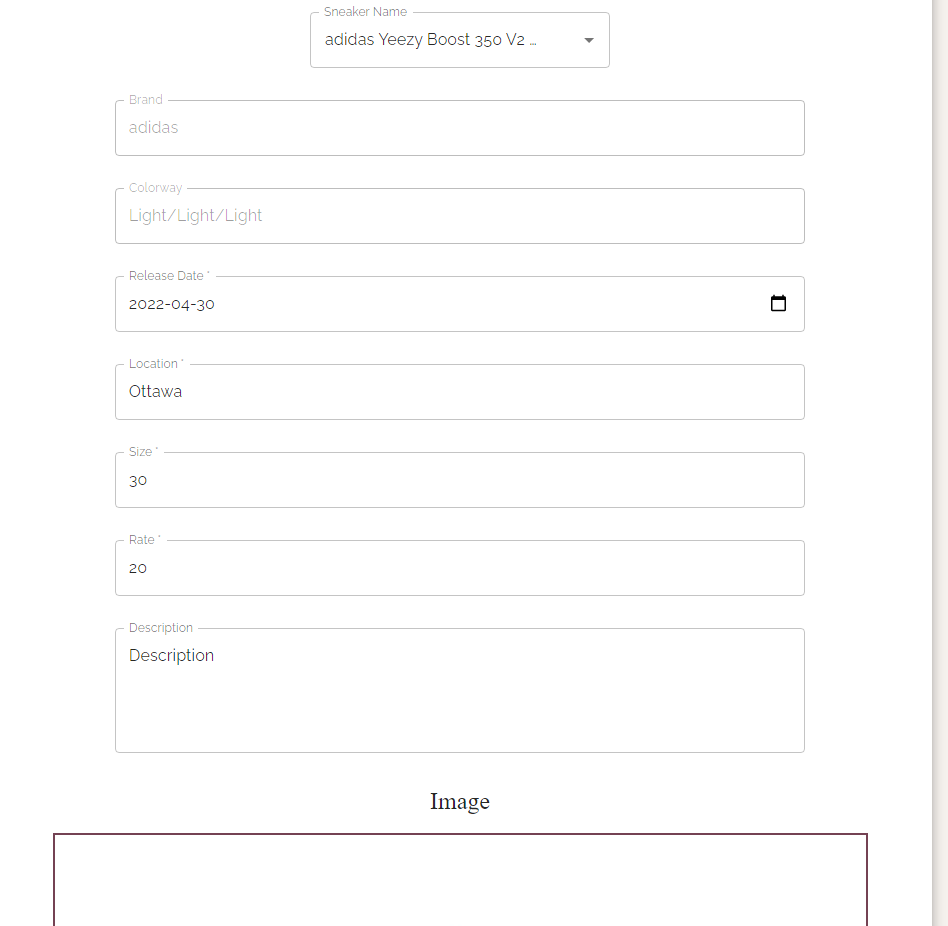 Alternatively, users may also use the application to list their own sneakers for rent and have the ability to rent out multiple sneakers at a time. To list a new sneaker, a user simply needs to fill out a form that captures information about the sneaker brand (ex: Adidas), name (ex: NMDs), size, release date, daily rate, and a brief description of the shoe. Users can also upload an image of the sneaker. Once submitted, this sneaker will be available for other users to rent.