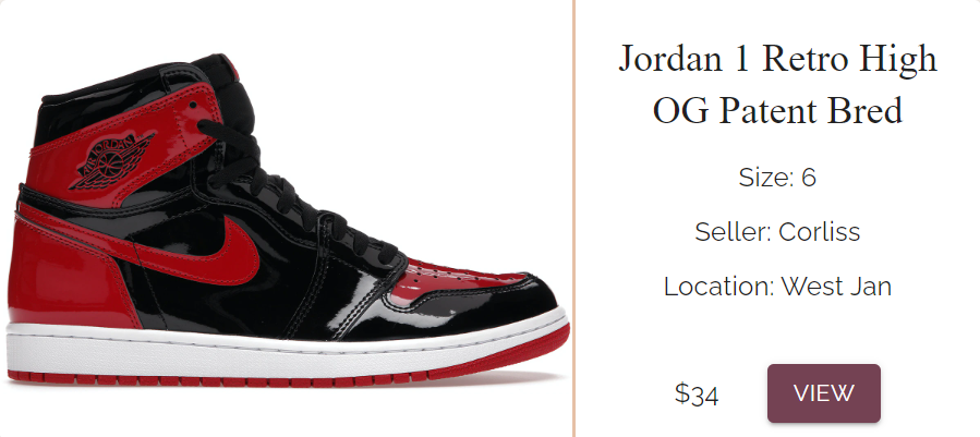 In general our application closely followed our UI design system. We implemented the chosen colours, fonts, and components and this greatly helped us in development of the frontend. For example the two screenshots below showcase the sneaker card view for our mockup versus our actual react application. The display, colours, and typography are generally the same. Below are more examples comparing our mockups to the actual application.