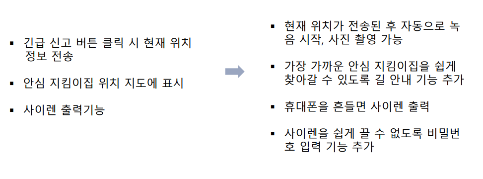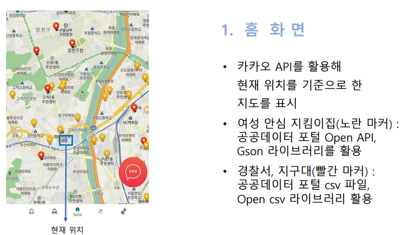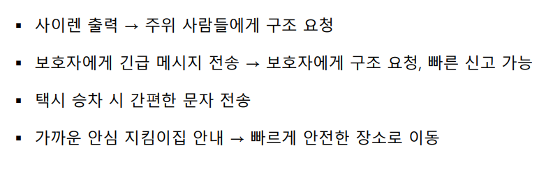 WithYou 여성과 아이들을 위한 안심 귀가 어플리케이션 1. 제작 기간 & 참여 인원 2021년 1월 11일 ~ 4월 29일 개인 프로젝트 2. 사용 기술 Android Android Studio java gson opencsv 3. 핵심 기능 3.1 홈 Fragment 빨간 말풍선 버튼 클릭 시 3.2 사이렌 Fragment 3.3 택시 Fragment 3.4 길 안내 Fragment 3.5 setting Fragment 4. 기존 앱과의 차이점 5. 기대 효과