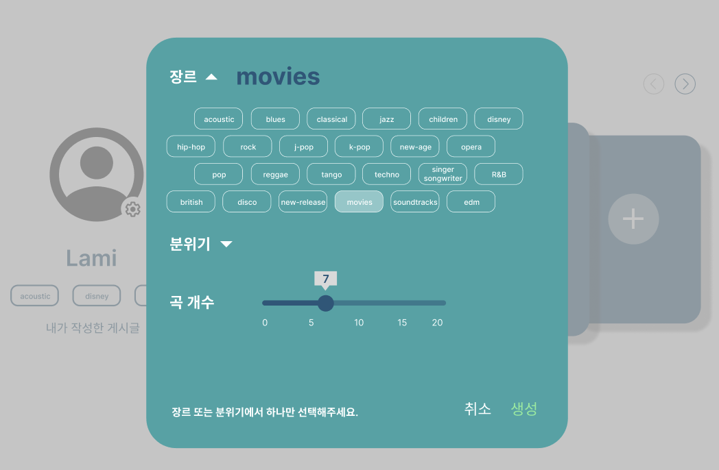 ## 목적 > 플레이리스트 생성 모달에서 장르 컴포넌트를 사용해서 생성 버튼 눌렀을 때 작성한 데이터를 토대로 플레이리스트 생성하게 하기 ## 작업 상세 내용 - [x] 장르 컴포넌트 사용 - [x] 선택한 장르와 곡 개수 객체로 저장 후 출력 - [ ] 생성 버튼 누르면 플레이리스트 생성 후 페이지 이동(아마 생성된 플레이리스트 페이지로?) ## 참고사항 <img width="524" alt="image" src="https://user-images.githubusercontent.com/87893624/196497415-ed15f61e-2632-4e5b-b4ed-364cba73f927.png">