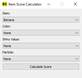 Since the 1.359 update to Banana Shooter, items have had a rarity score associated with them. metotallynot (on Discord) compiled a list of the rarity scores for each parameter (rarity, colour, shiny and particles) and I've used it to create this program which you can use to calculate the rarity score for any possible cosmetic item