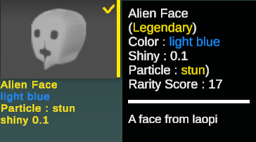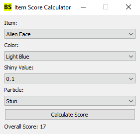 From here you can select the item of choice from the dropdown, the colour of choice from the dropdown, the shiny value of choice from the dropdown and the particle of choice from the dropdown. After this you can press Calculate score to calculate the score. In the below example I chose a Light Blue, 0.1 Shiny Alien Face with a Stun Particle, which has a rarity score of 17 as also shown in the subsequent in game screenshot