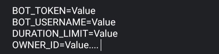 API_ID: API_ID as from telegram appsAPI_HASH: API_HASH as from telegram appsSTRING_NAME: Make a string session of the alternate account that will be used by the bot to play music, (this account will not be able to hear music) hereBOT_TOKEN: Make a Bot from @Botfather and fill it's bot token.BOT_USERNAME: Your bot username, to help create handlers.OWNER_ID: Needed sometimes, so fill it.START_PIC: The pic displayed when a person starts your bot, use telegraph for it.PLAY_PIC: The pic to show playing message and stop message.SUDO_USERS: Fill the userids of the users who will have full control over bot at any group, with spaces between them (dont forget to add your own id kek!)