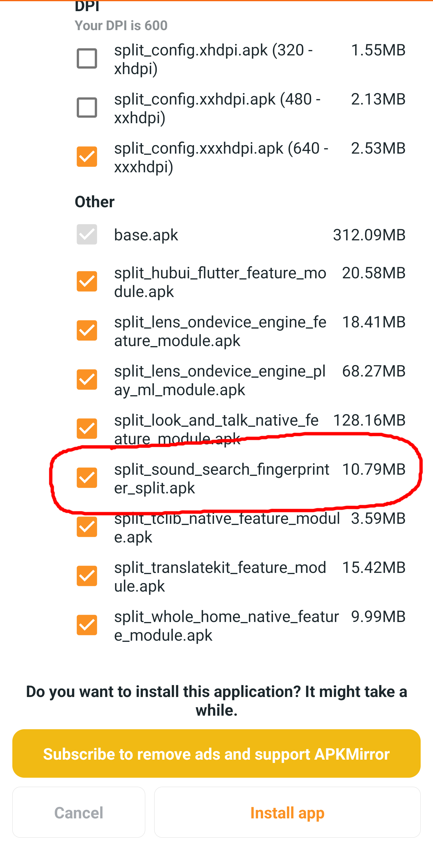 split_sound_search_fingerprinter_split.apk. If you do not, stop and restart as the build you have downloaded does not contain the required sound search split.