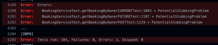 Не знаю как обойти ошибку UnfinishedStubbingException в BookingServiceTest, погуглила, но никакого решения не нашла |