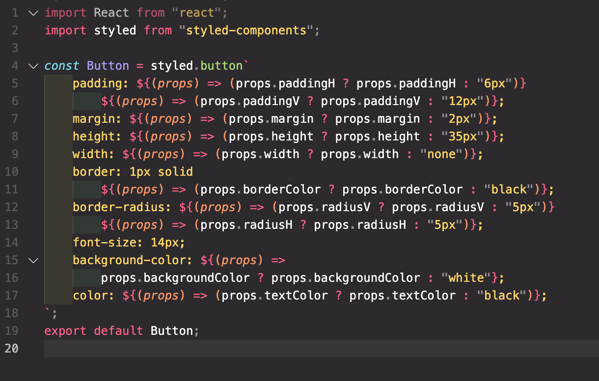 Button 컴포넌트는 현재 props 를 받아 그대로 StyledButton 에 전달하고 있는 역할만을 가지고 있는데요,