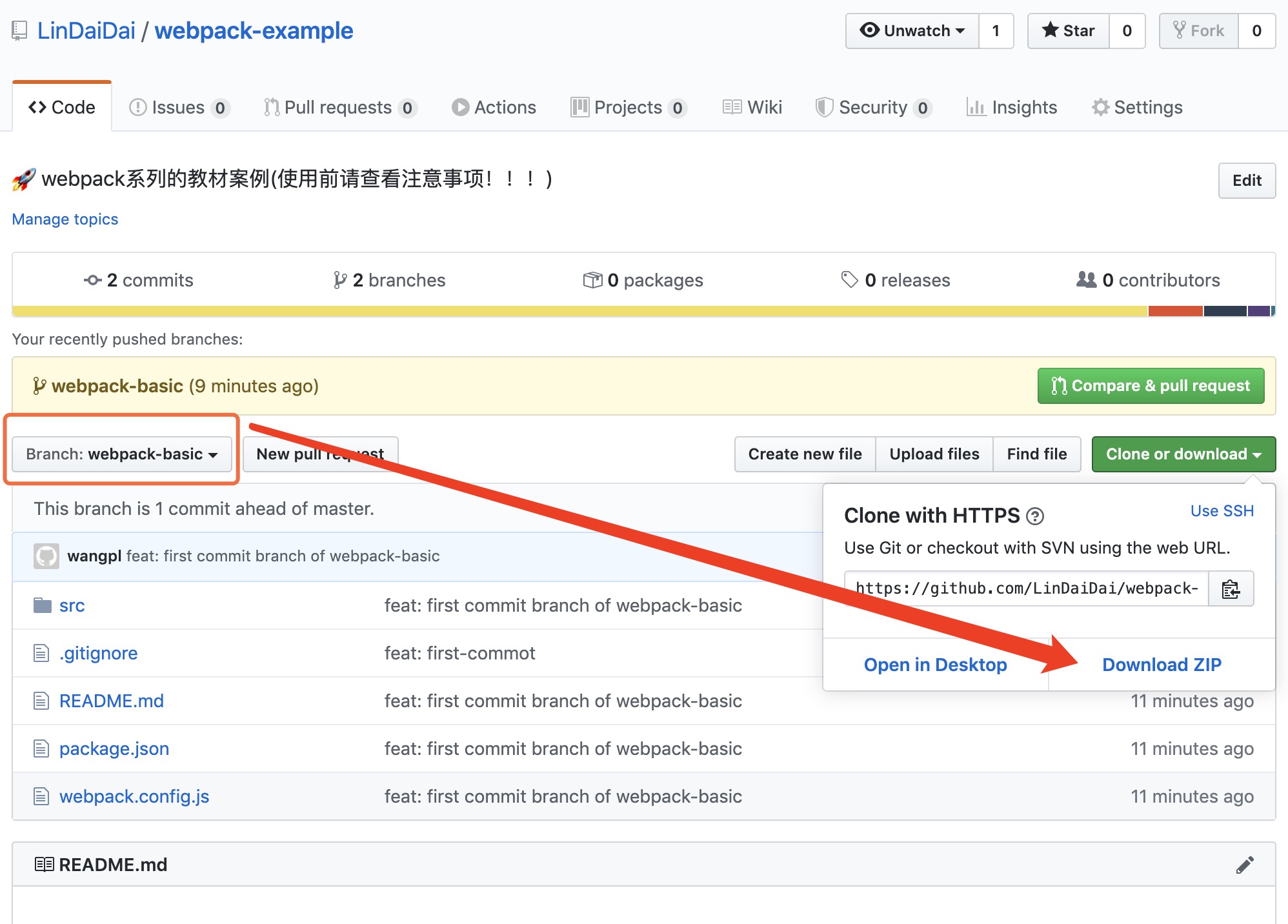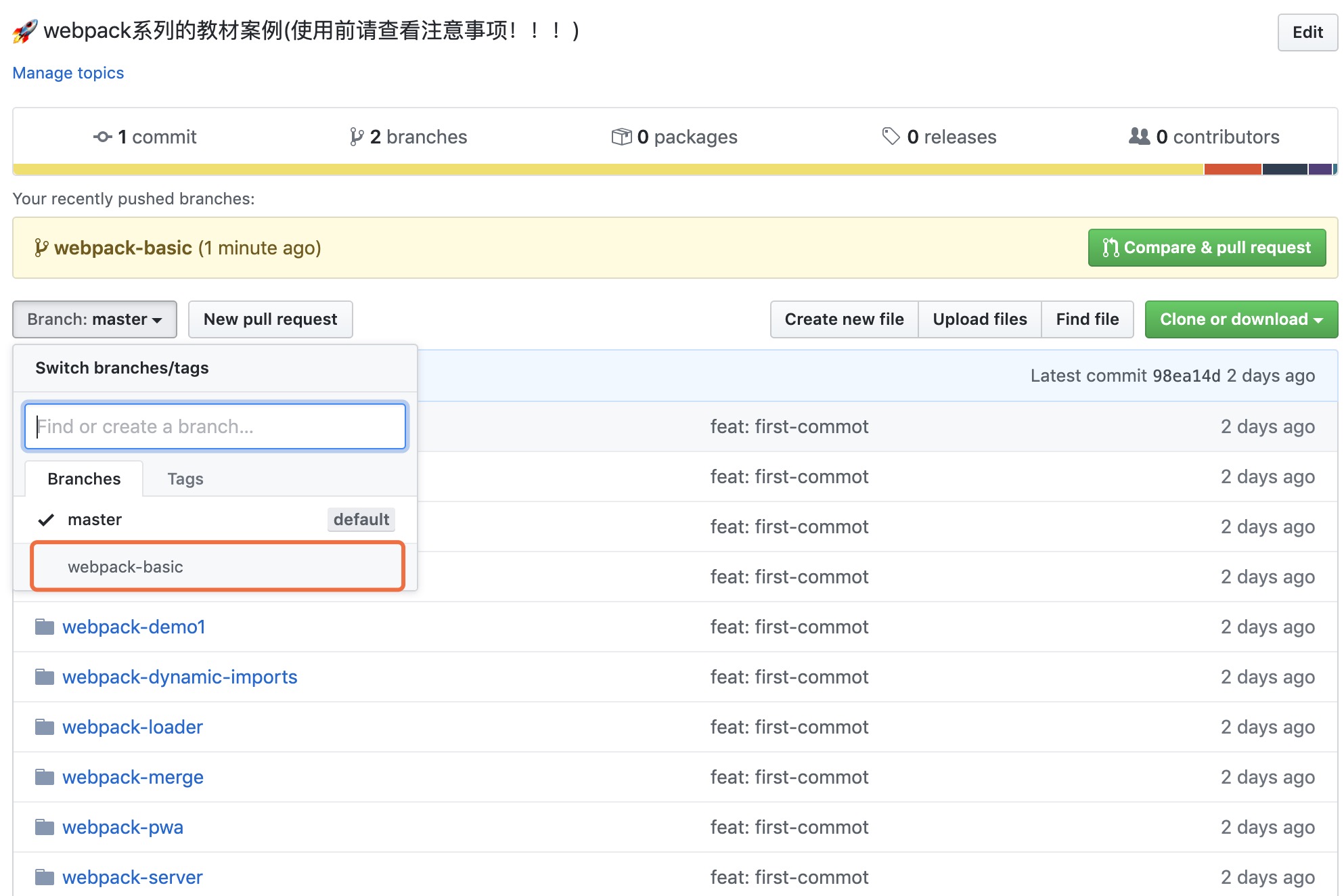 例如你是想要webpack-basic这个案例的话,可以点击Switch branches/tags这里切换分支,此时下载下来的就是单独的案例了。
