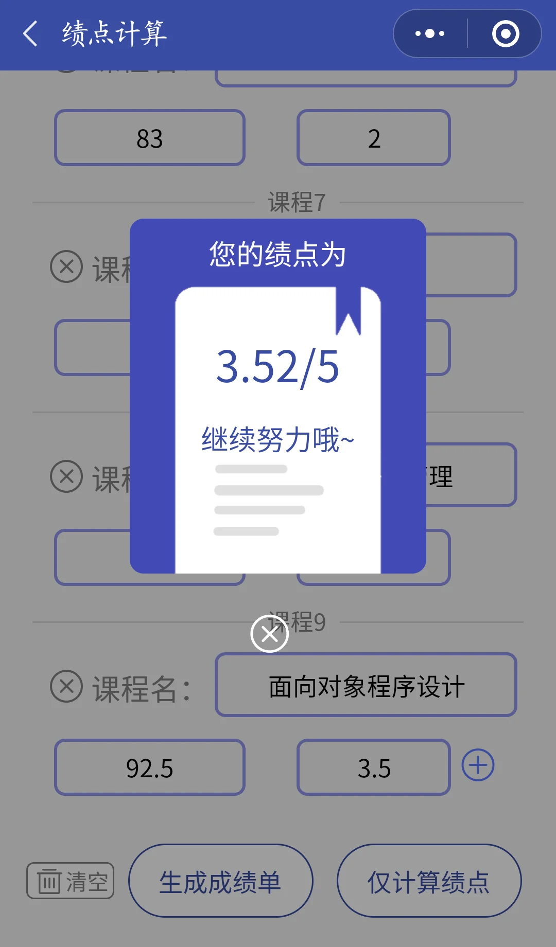 本小程序可以根据输入的课程信息生成学生本人成绩单(需要完整信息),也可以只用于计算平均学分绩点(只需成绩和学分信息)。若有个别科目为五级分制(ABCDF),要将分数化为对应的百分制成绩填入到成绩栏内。