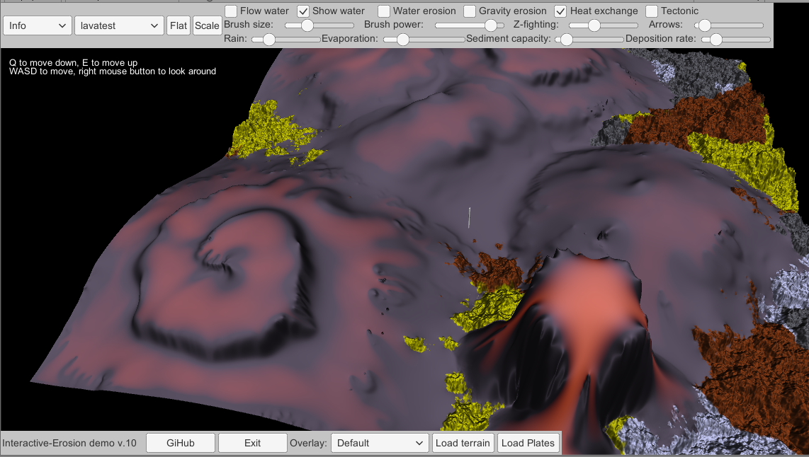 The idea behind this project is to erode a height map through a series of natural processes to help create a more realistic height map. Three processes are applied to the height map each frame and can be classed as force-based erosion, dissolution-based erosion and material slippage. All of these processes are carried out on the GPU. The height map can be represented by a series of layers (4, one for each RGBA channel) and each can have different erosion settings applied to it. The lower layer represents the base rock layer and the top layer represents soft soil/sand were any sediment is deposited.