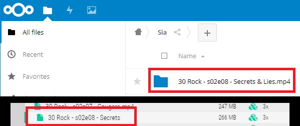 In Sia-NextCloud, it thinks it's a folder named 30 Rock - s02e08 - Secrets & Lies.mp4.