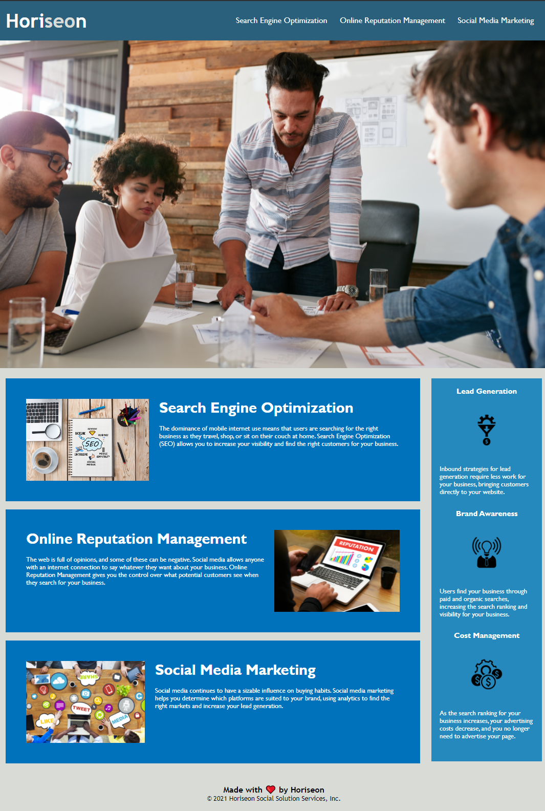 Horiseon Purpose A website that offers SEO and other online marketing services including social. Built With HTML CSS Live Website https://paulthomaswi.github.io/Horiseon Github Repo http://github.com/paulthomaswi/horiseon Website Screenshot (https://user-images.githubusercontent.com/87770976/128617300-c9a2c489-648a-4780-ac0c-1578d8aee113.png) Contribution Made with ❤ by Horison ©2021 Horiseon, Inc![horiseon]