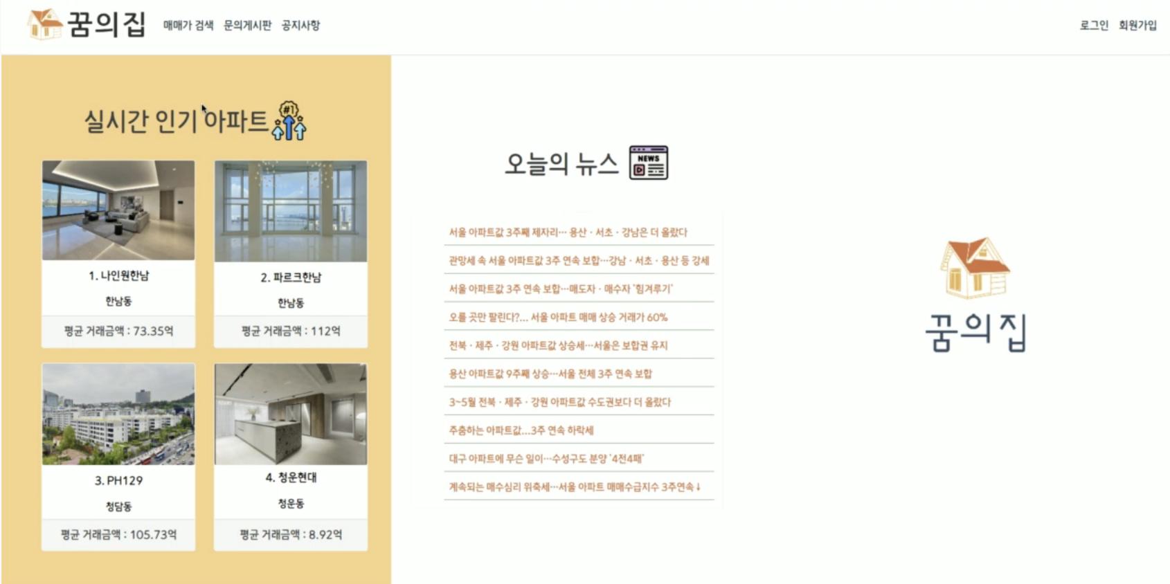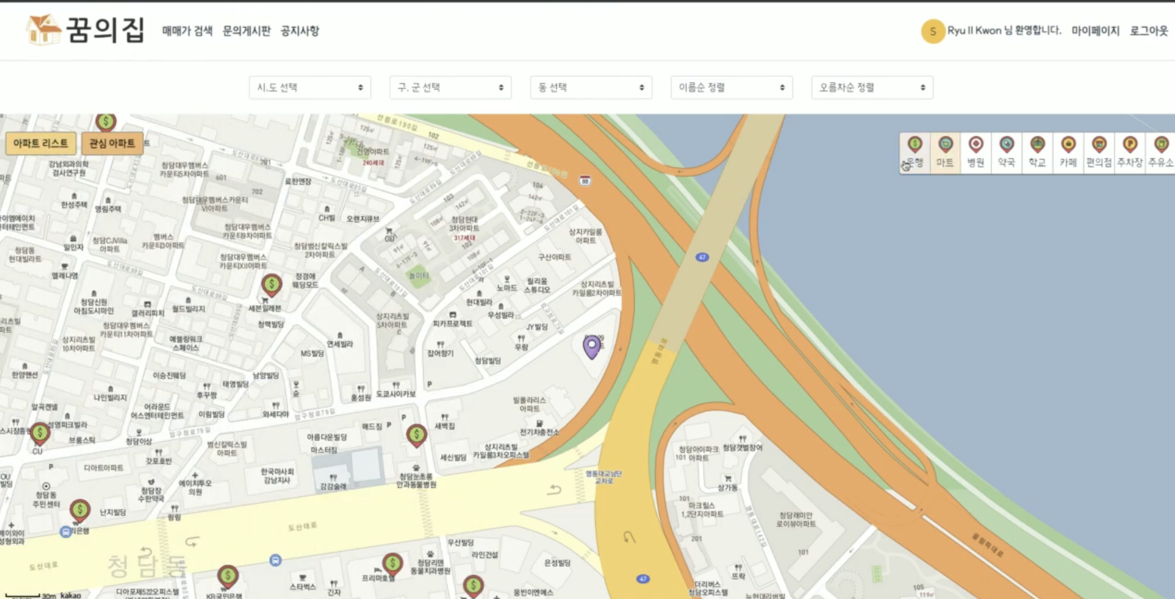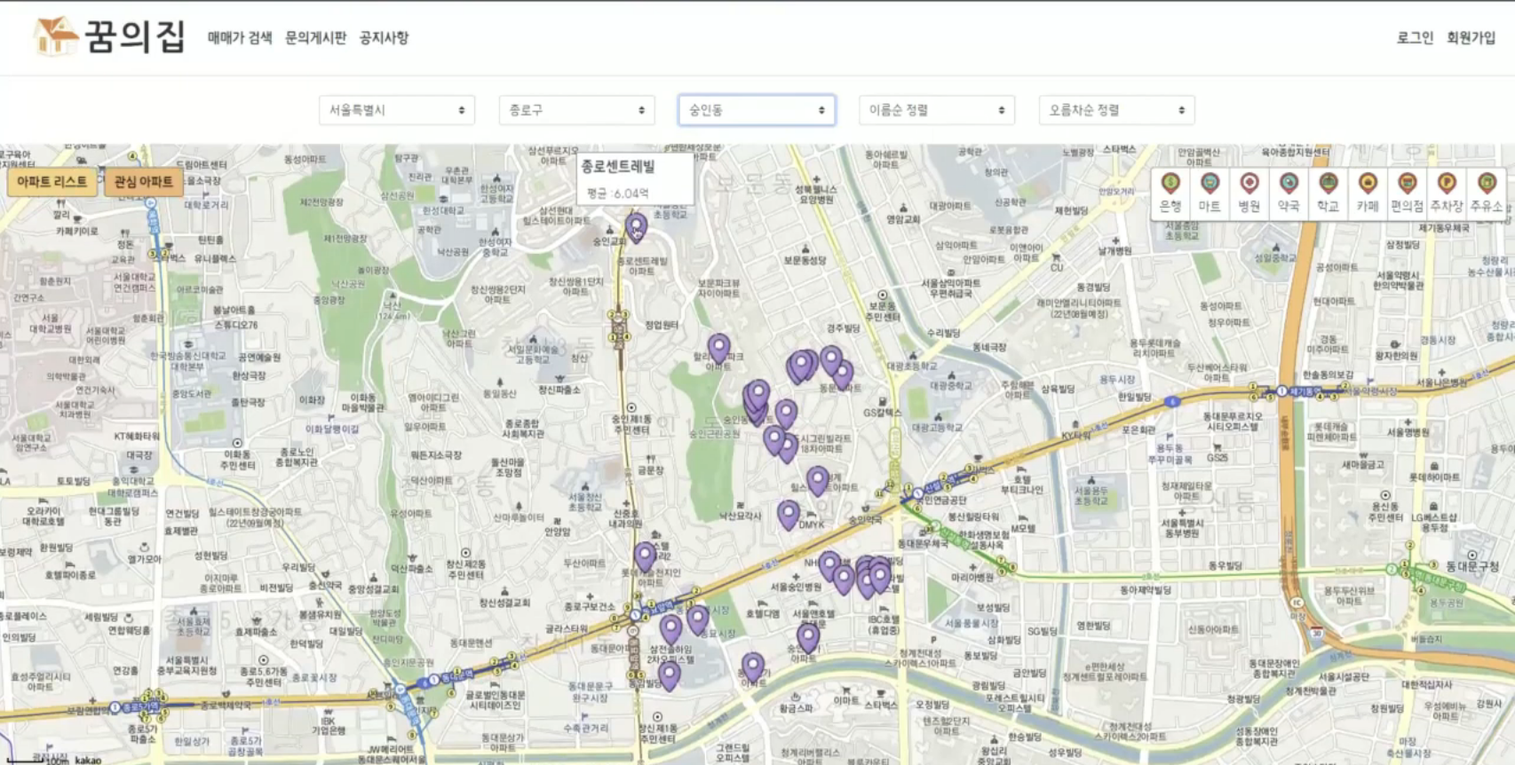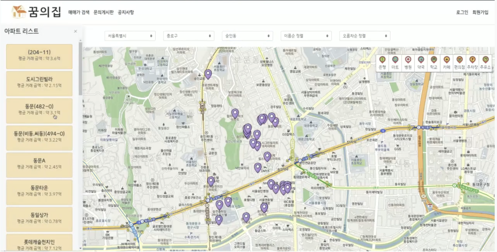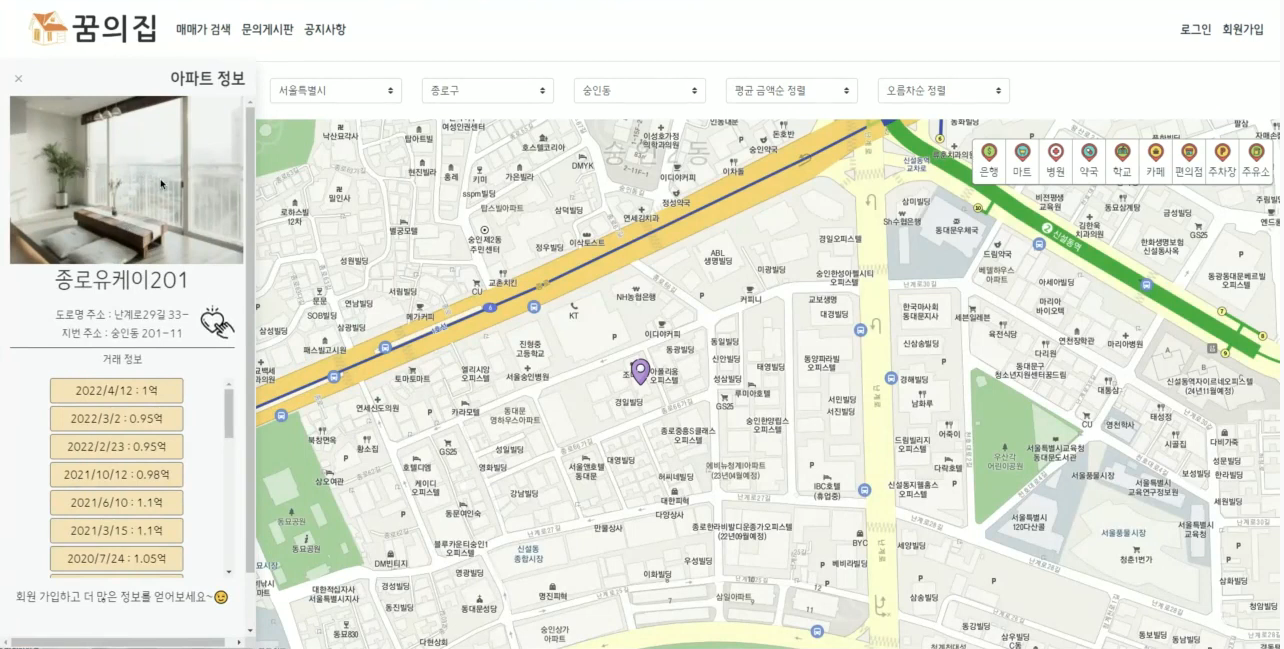 지역을 선택하면 해당 지역의 아파트 목록이 지도에 핀으로 찍히고, 핀에 마우스를 올리면 아파트 이름과 평균 매매가 팝업을 볼 수 있습니다.