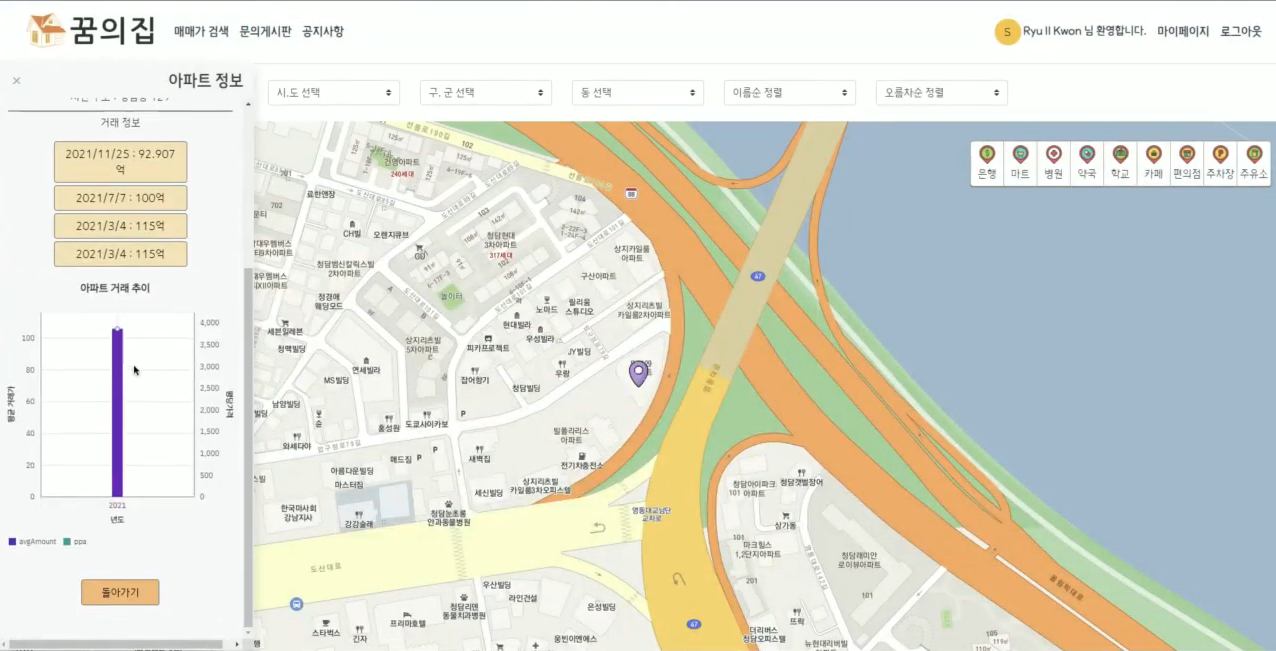 아파트 리스트에서 아파트를 선택하여 누르면, 해당 아파트의 매매 내역 상세 정보가 나타납니다.
