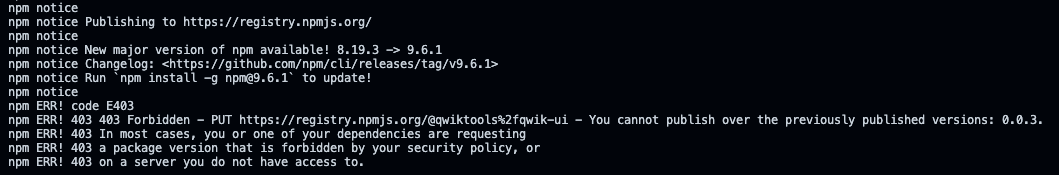 Getting this error currently while trying to publish, I am the member of qwiktools on NPM.