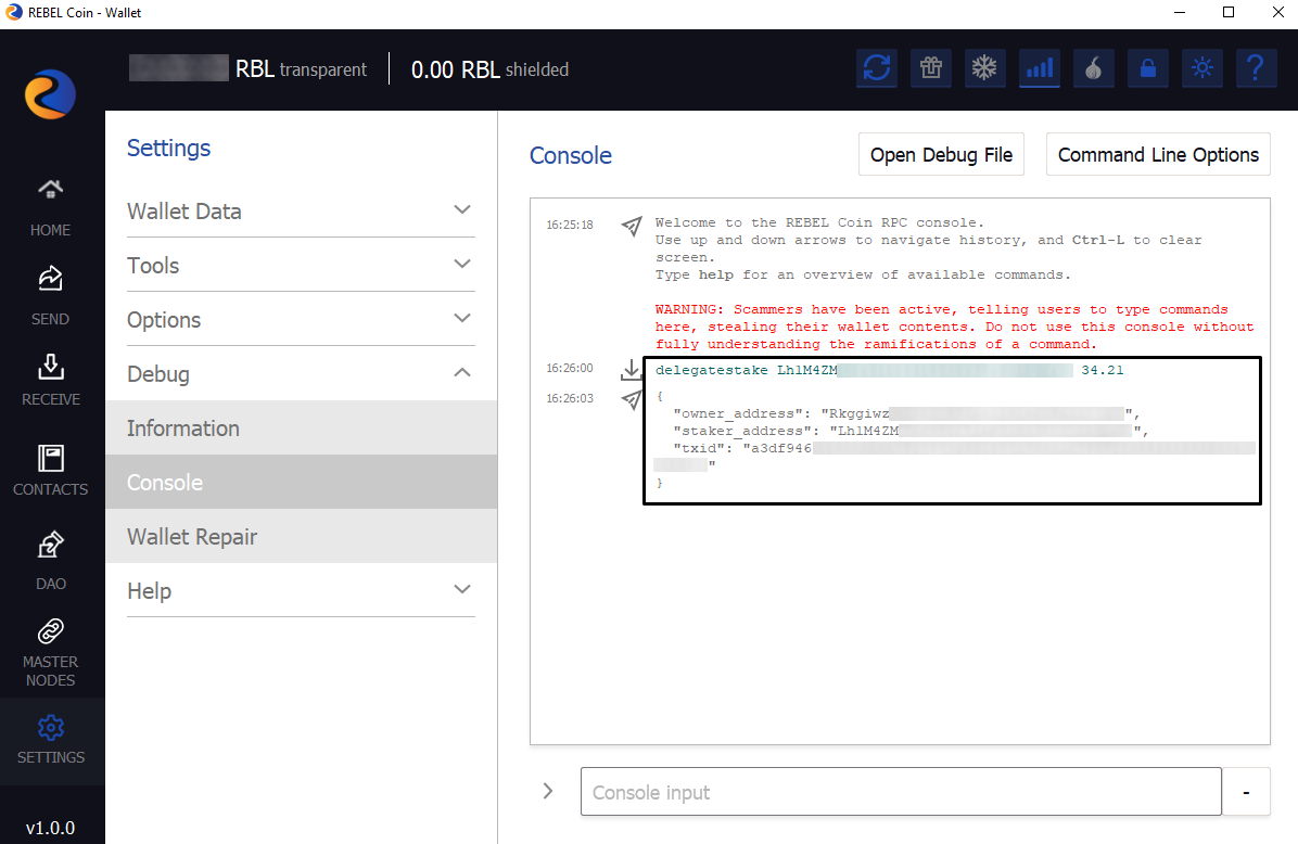 ownerAddr. - ) coin-owner selects a number of coins (or choses a REBEL Coin amount letting the wallet pick the coins) and creates the special "stake delegation" transaction, using
