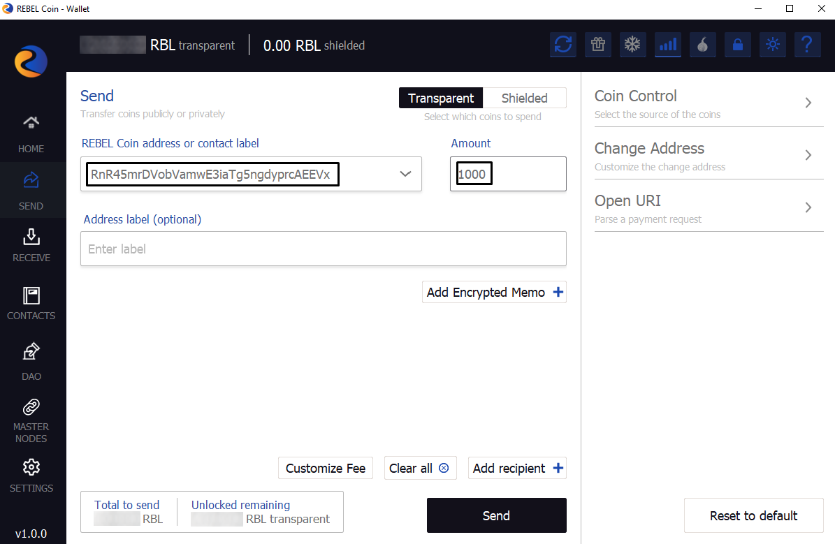 2. Send 1000 REBELCoin to copied address