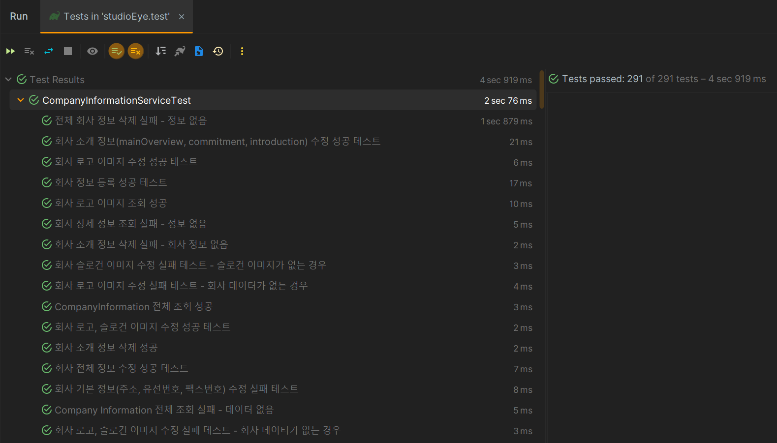 주된 로직이 존재하는 Application Layer의 Service 클래스 위주로 단위 테스트를 작성했습니다. 총 291개의 단위 테스트를 작성했으며, 각 테스트마다 성공, 실패 케이스가 최소 1개씩 포함되도록 했습니다. 실패 케이스는 다양한 이유로 발생할 수 있기 때문에 여러 상황을 가정하여 작성하고자 했습니다.