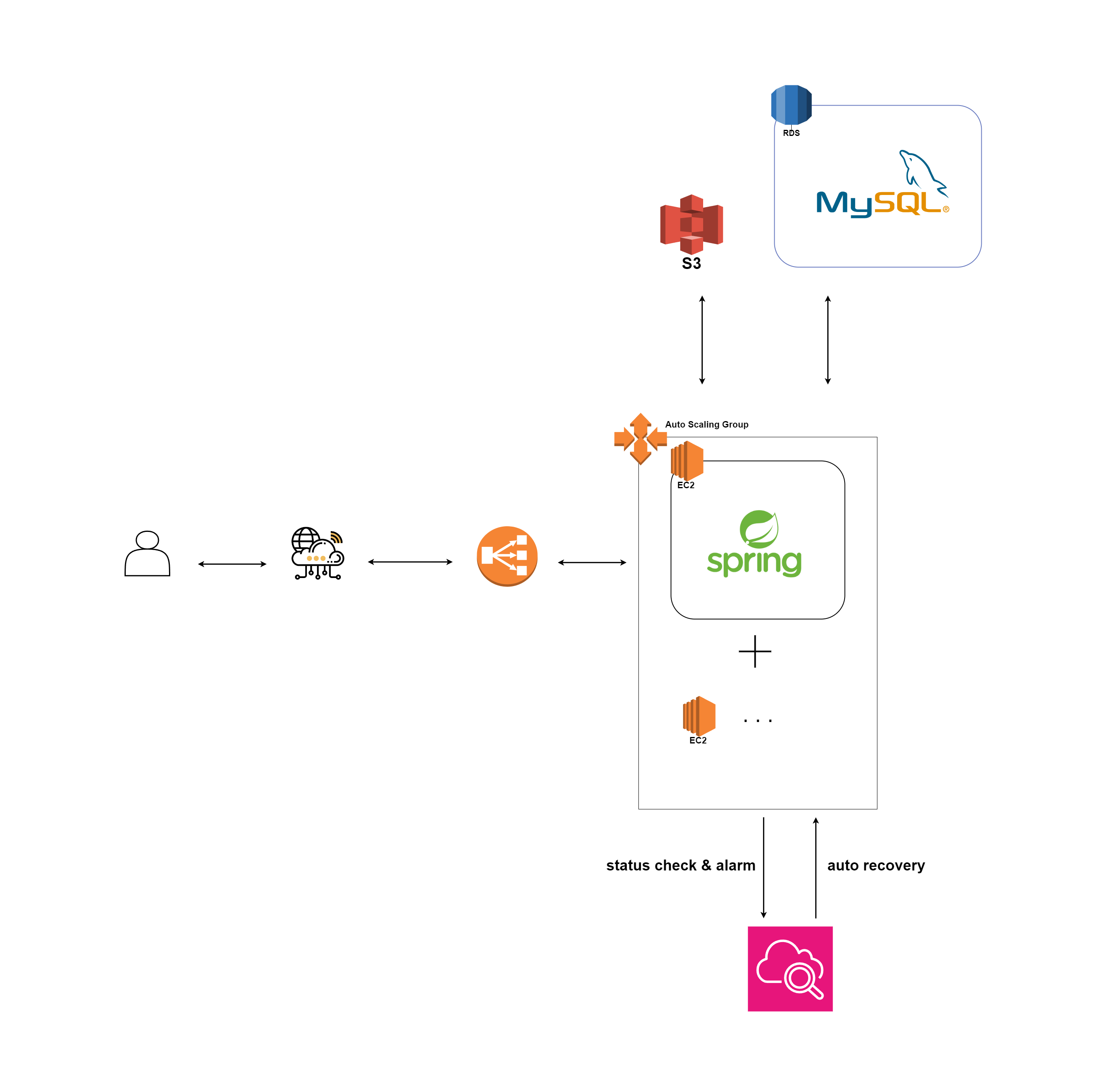 고객사의 요구 사항인 '개발자 없이 운영할 수 있는 서비스'에 맞추어 고객사로 서버 이전 시 사용할 아키텍처입니다. 많은 사용과 그로 인한 트래픽보다 가끔 사용할 서비스가 필요한 상황이었고, 비용과 편의성을 고려하여 구성했습니다. 최소한의 서버 확장을 위해 AWS 오토 스케일링으로 서버를 늘리고, 서버에 문제가 생겼을 시 AWS Cloudwatch 알림을 통한 자동 회복이 가능하도록 구성했습니다.