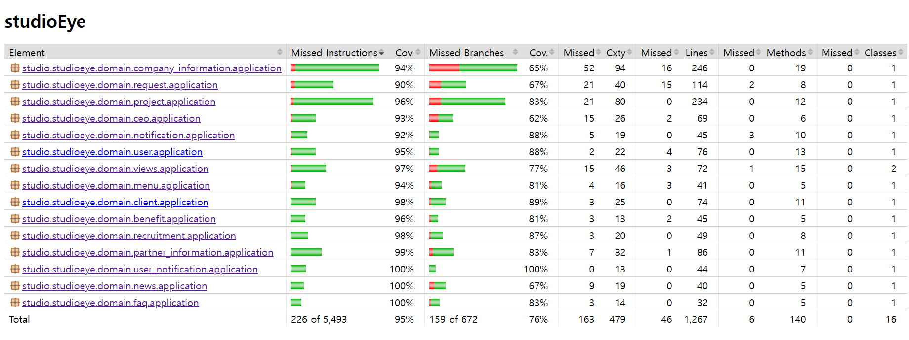 테스트 코드 작성 후 커버리지를 확인하여 테스트 범위를 늘려갔습니다. 커버리지를 확인하며 부족한 부분을 확인할 수 있었습니다. 특히, 다양한 실패 케이스 작성에 큰 도움이 되었습니다. 명령어 커버리지와 분기 커버리지를 기준으로 각 80%, 60% 이상을 목표로 했습니다. 초기 50% 미만이었던 명령어 커버리지는 프로젝트 종료 시점 95%를 달성했으며, 분기 커버리지는 76%를 달성했습니다.