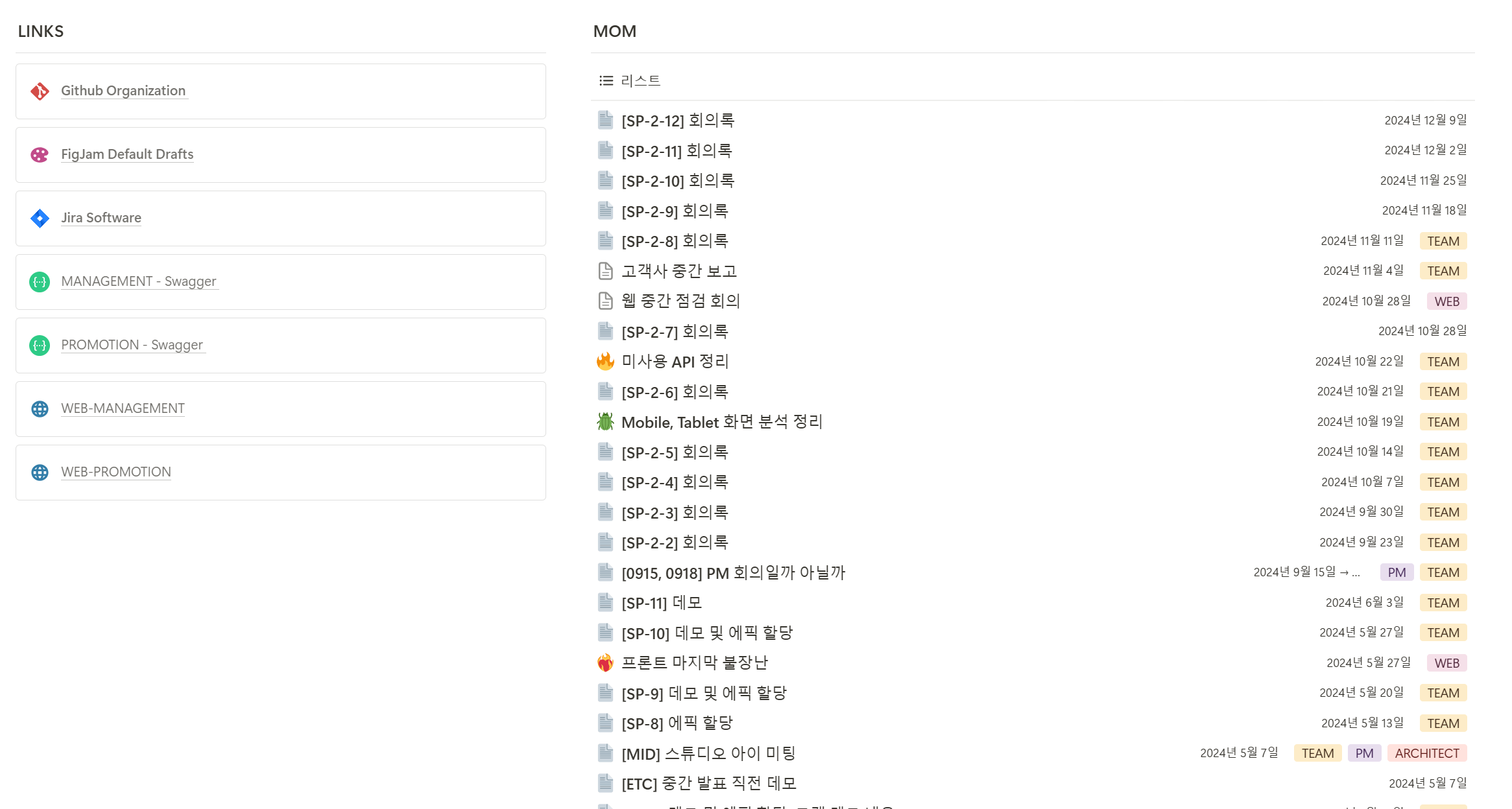 Notion에서 공간을 나누어 수업 및 프로젝트 정보와 회의록을 관리했습니다.