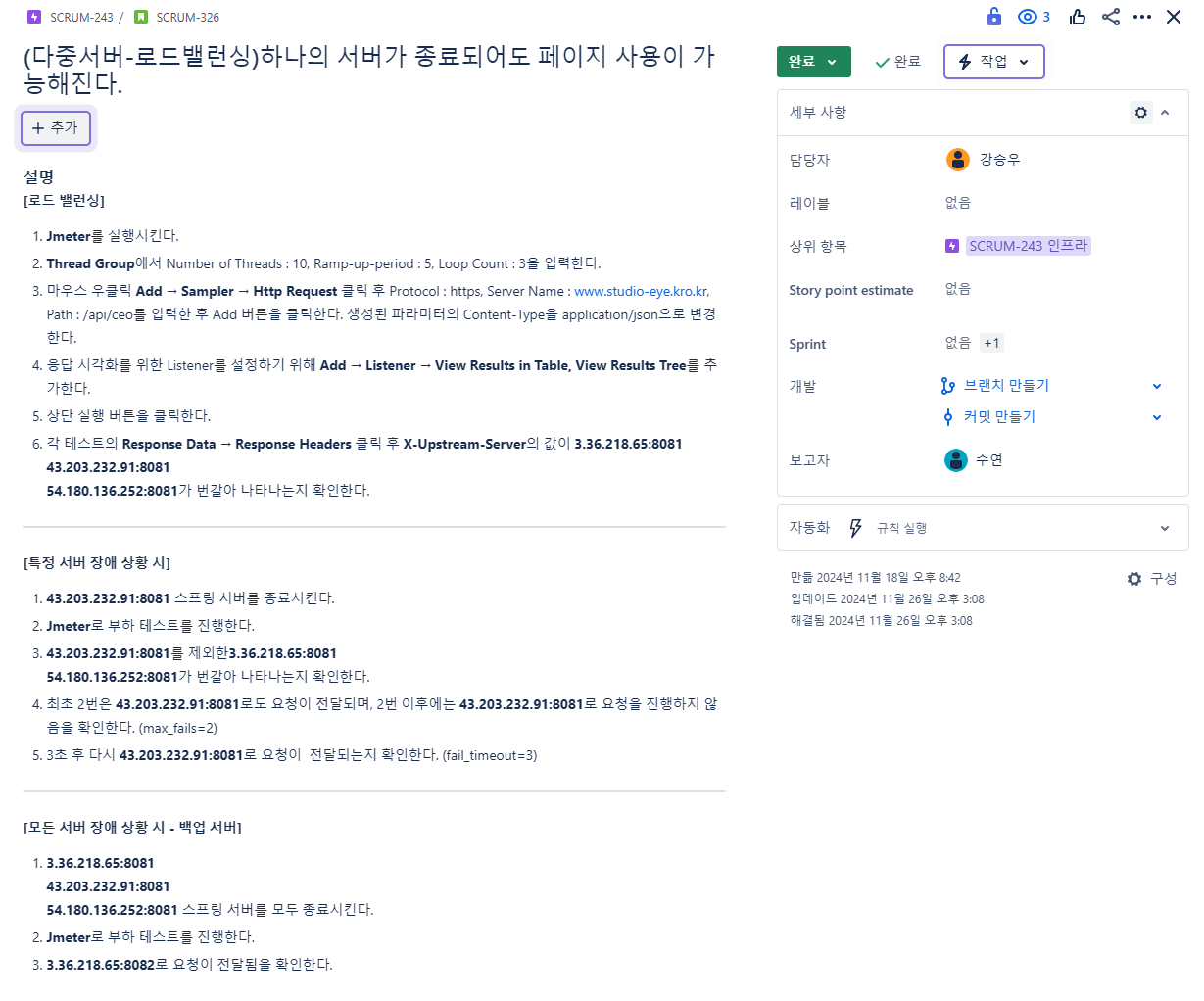 - Nginx를 로드밸런서로 3개의 스프링 서버로 트래픽 분산