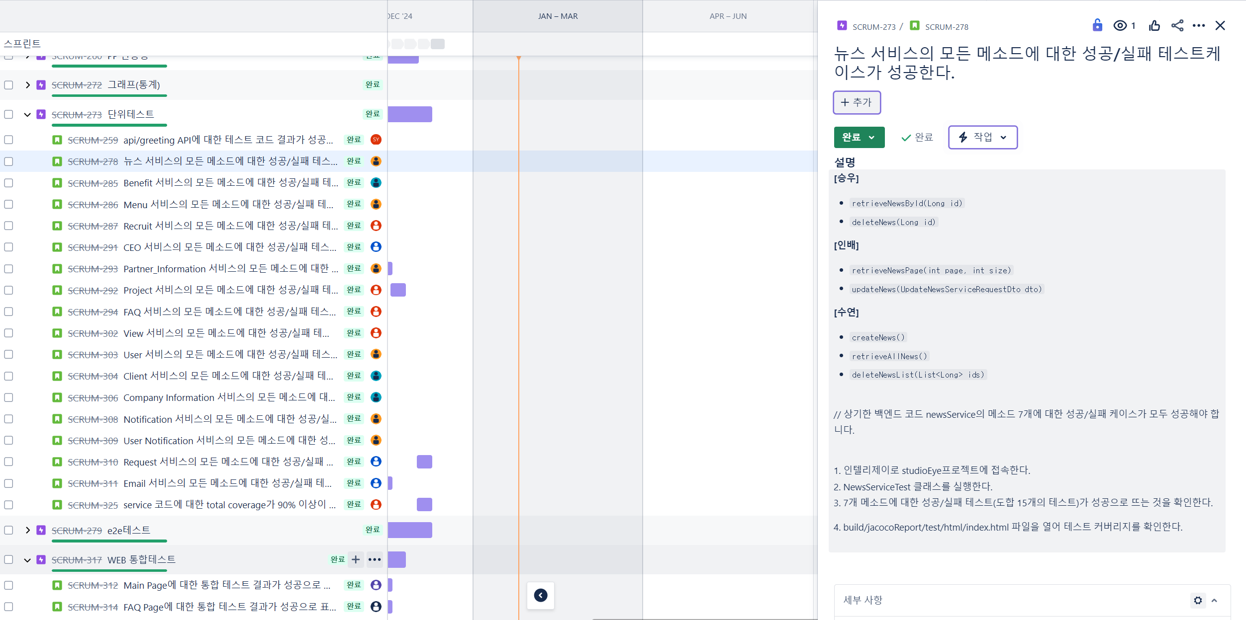 초기에 스프린트를 위해 전체 일정과 작업(백로그)를 설정했고, Jira를 사용하여 매주 업무를 할당했습니다. 해야할 작업을 에픽으로 설정하여 프로젝트 완성을 위한 큰 틀을 잡고, 세부 task를 만들었습니다. task는 데모 시나리오를 포함하였고, 매주 Jira에서 할당받은 작업을 데모했습니다.