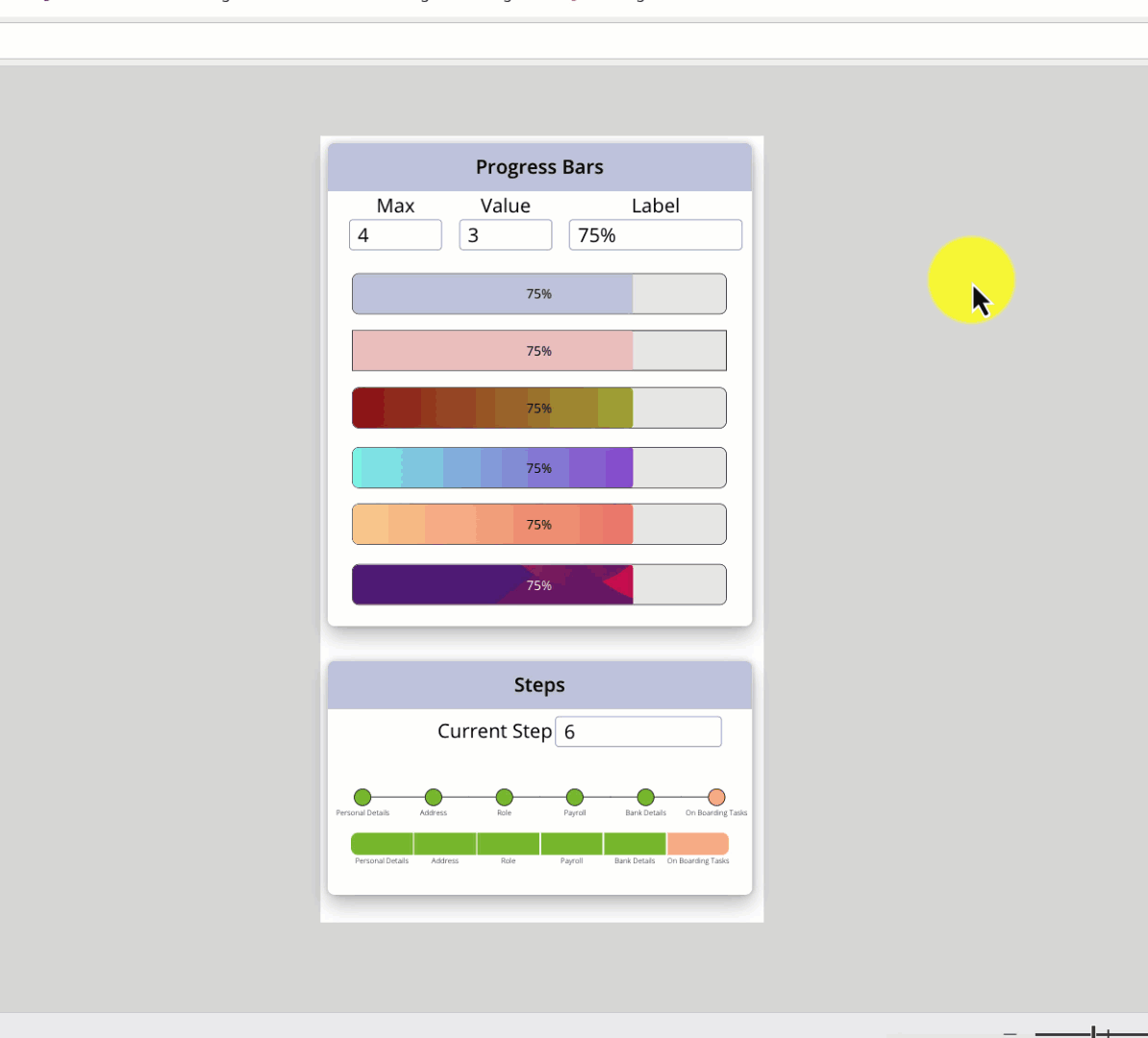 We have two "steps" controls that accept a table of objects and the current step as inputs.