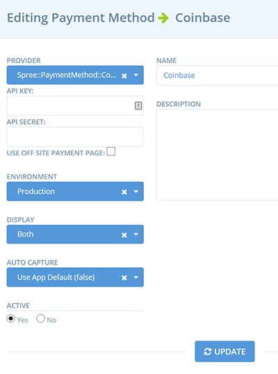 Select "Spree::PaymentMethod::Coinbase" from the "Provider" dropdown, enter a name (like "Bitcoin") for the payment method, and click "Create."