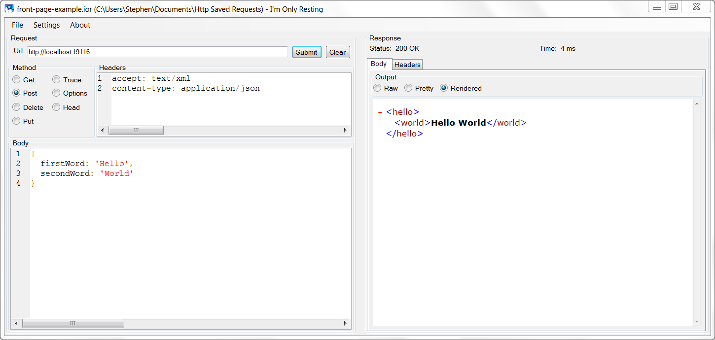 - Rendered - content is rendered in an embedded IE browser instance. XML, HTML, and images are rendered using IE's rendering engine. JSON is rendered using JSON.NET pretty-printing embedded in an html pre tag. Other types of plain text are embedded in an html pre tag. IE's search feature is enabled.