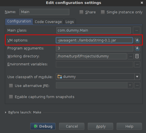 java -agentlib:jdwp=transport=dt_socket,server=y,suspend=y,address=5005 -javaagent:/tmp/lambda-string-0.2.jar my.dummy.Main
