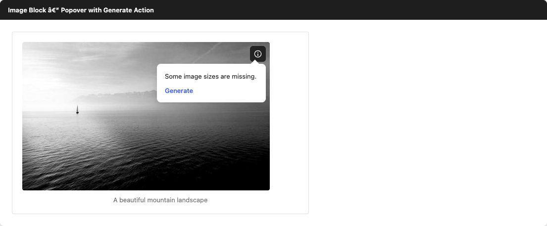 flowchart TD A[Editor Loads] --> B[Fetch attachment data via REST API] B --> C{Missing image sizes?} C -->|No| D[Normal editing] C -->|Yes| E[Show info icon on image] E --> F[User clicks icon] F --> G["Popover: Some sizes missing — Generate"] G --> H[User clicks Generate] H --> I[Fetch original image] I --> J[Process missing sizes client-side] J --> K[Sideload to server] K --> L[Invalidate cache & hide indicator] A --> M[User opens pre-publish panel] M --> N{Any images with missing sizes?} N -->|Yes| O["Show Missing image sizes panel"] O --> P[User clicks Generate] P --> Q[Process all missing sizes] Q --> R[Spinner until complete]Screenshots