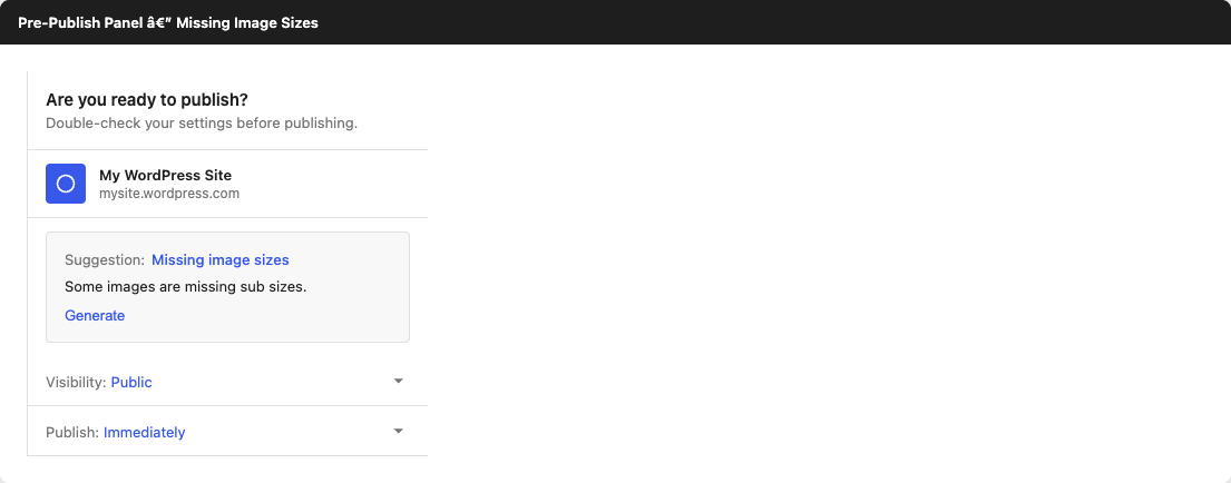 The pre-publish panel shows a suggestion to generate missing sizes for all images: