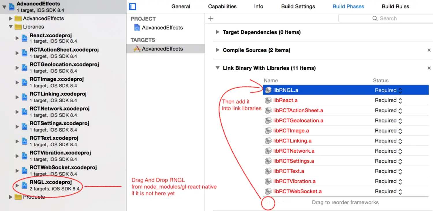 打开node_modules-gl-react-native-ios,将RNGL.xcodeproj拖到你的iOS项目Libraries目录中,并在Build Phasses的Link Binary With Libraries链接libRNGL.a库文件