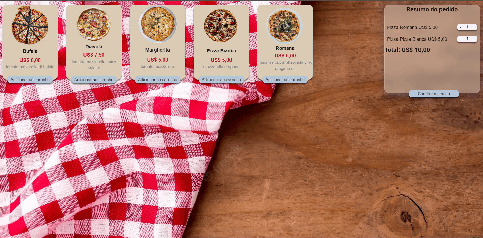 O projeto consiste em uma página que permite ao usuário escolher entre 5 sabores de pizza, adicioná-los ao carrinho, aumentar ou diminuir as quantidades, remover do carrinho e concluir o pedido com sucesso. Para isso, foi criado um banco de dados próprio.