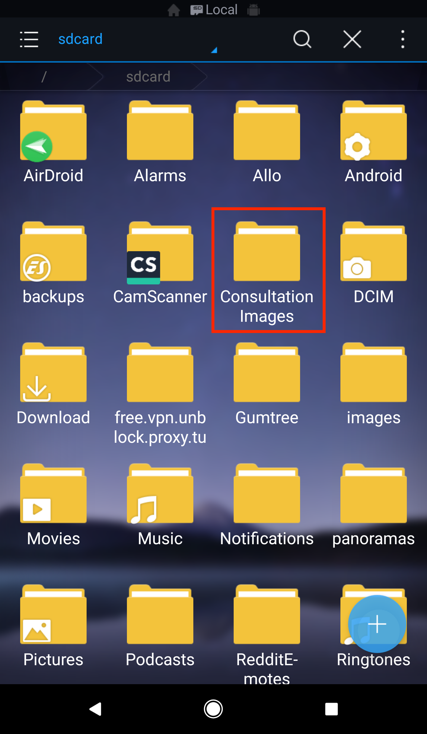 When the app is installed to devices with no external SD Card, just like the Google Pixel XL (1st gen) that I used to test the app on in this case, a subdirectory structure with a root folder named Consultation Images will be created in the root path of the device internal storage, usually at /storage/emulated/0.