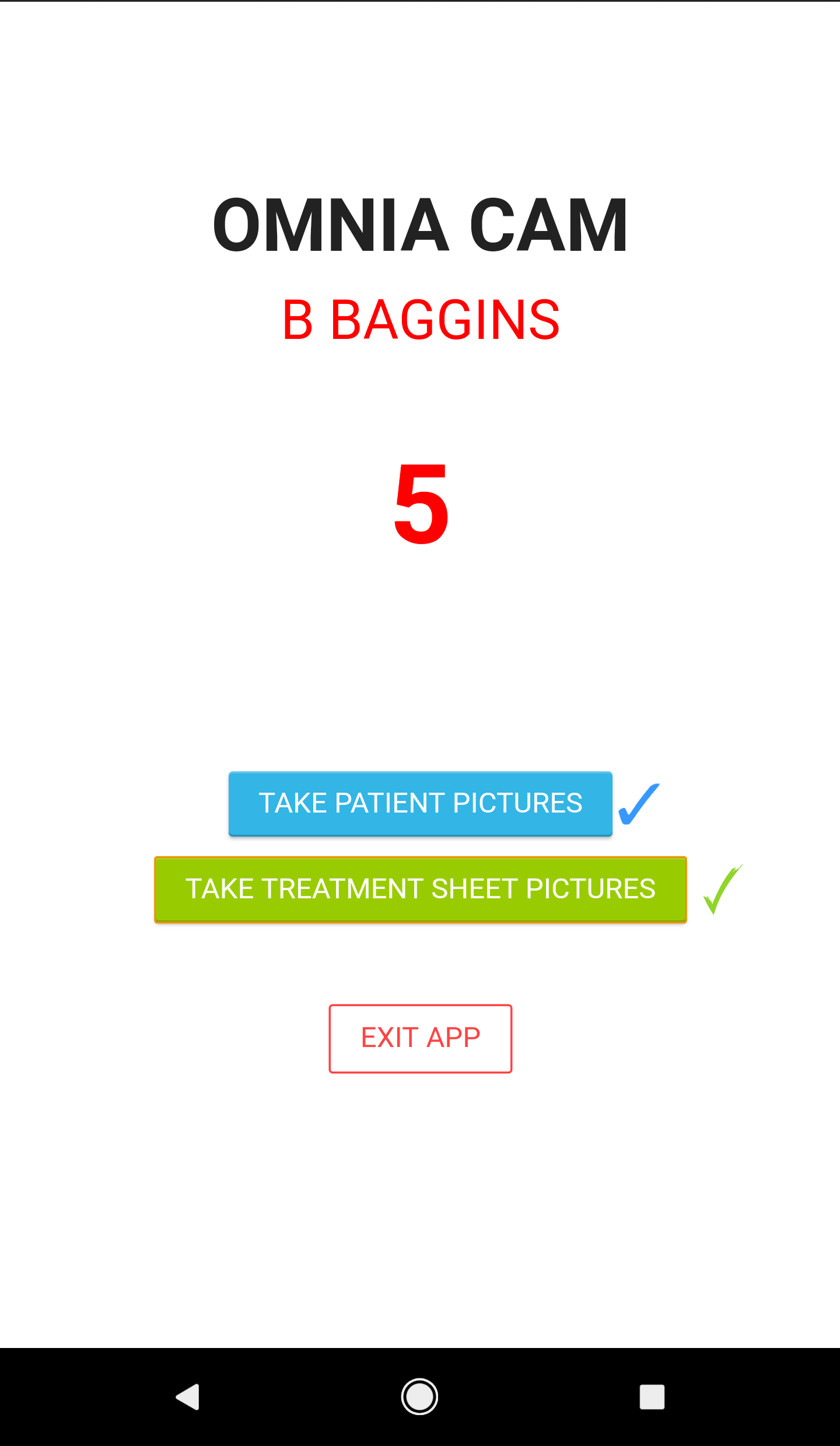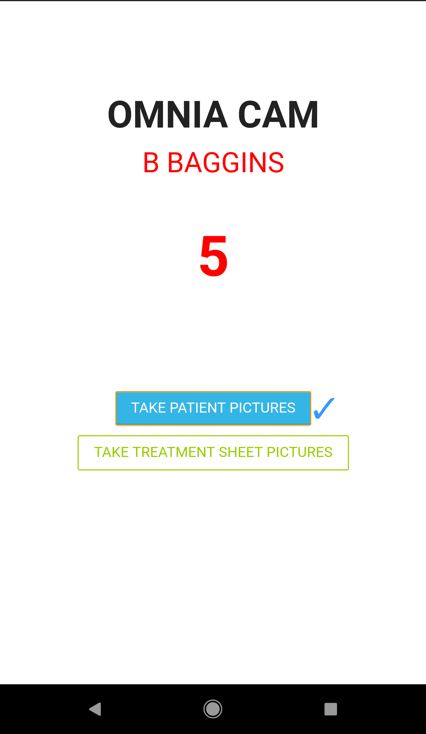 When the user presses either TAKE PATIENT PICTURES or TAKE TREATMENT SHEET PICTURES, a blue check or a red check will appear next to the corresponding button pressed and the camera interface will open up.