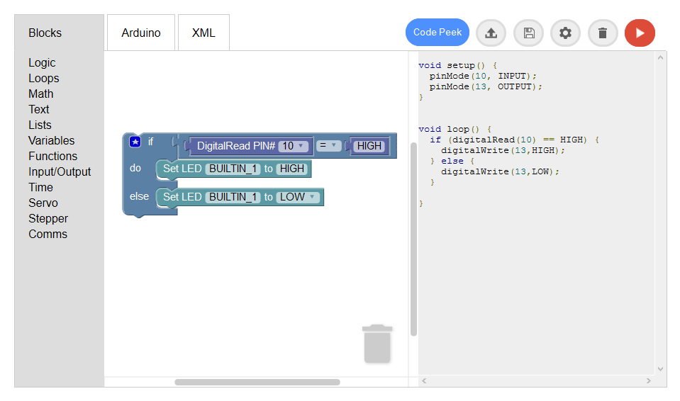 Ardublockly is a visual programming editor for Arduino. It is based on Google's Blockly, which has been forked to generate Arduino code.